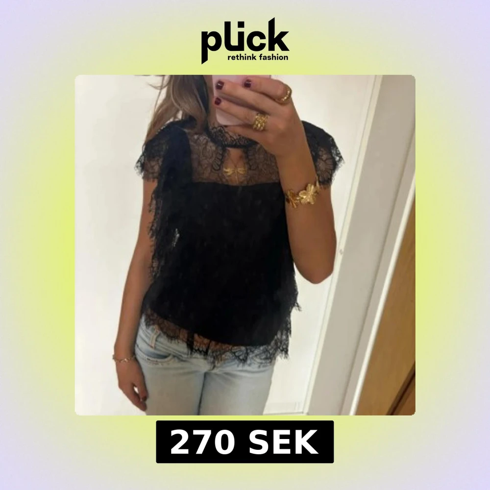 Lånade bilder från hon jag köpte ifrån! Skriv för egna bilder🥰Säljer en svart blus i spets med volangdetaljer på axlarna och transparent överdel. Blusen har korta ärmar och fina spetskanter både upptill och nertill.