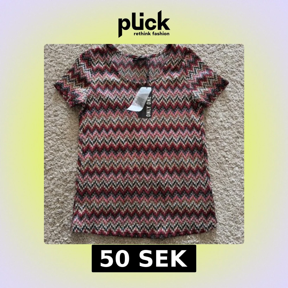 Färgstark omlottopp från ONLY med kort ärm och coolt sicksackmönster i rosa, rött, svart, beige och guld. Toppen har omlottdetalj baktill och är tillverkad i ett glittrigt, stretchigt material som ger en unik look.