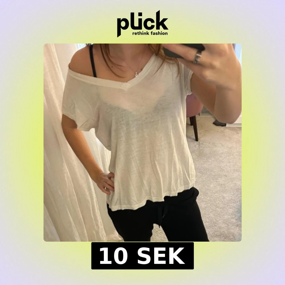 Säljer en vit, tunn och loose topp med v-ringning och korta ärmar. Toppen har en avslappnad passform och kan bäras offshoulder för en chill vibe. Materialet känns lätt och luftigt, perfekt för varmare dagar.