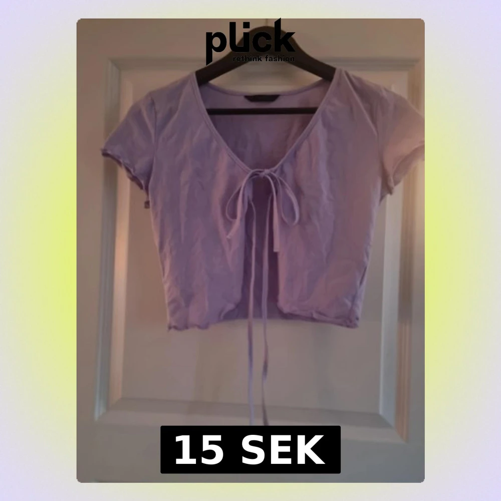 Säljer en ljuslila croppad topp med korta ärmar och v-ringning. Toppen har en snygg knytning framtill som ger en trendig look. Materialet känns mjukt och är troligtvis bomull eller en bomullsblandning. Perfekt att styla med jeans eller kjol för en chill vibe.