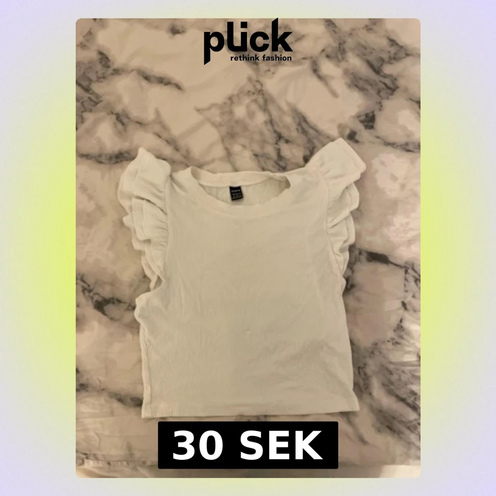 Säljer en söt vit ribbad topp från SHEIN i storlek M. Toppen har korta volangärmar och rund halsringning. Materialet är stretchigt och mjukt, perfekt för en trendig och bekväm look. Passar till jeans eller kjol för en fräsch outfit.
