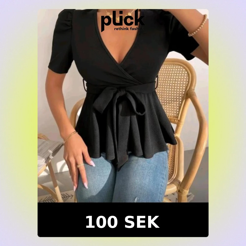 Stilren svart topp med v-ringning och korta puffärmar. Toppen har ett brett knytband i midjan som markerar figuren och ger en snygg siluett, perfekt till jeans eller kjol.