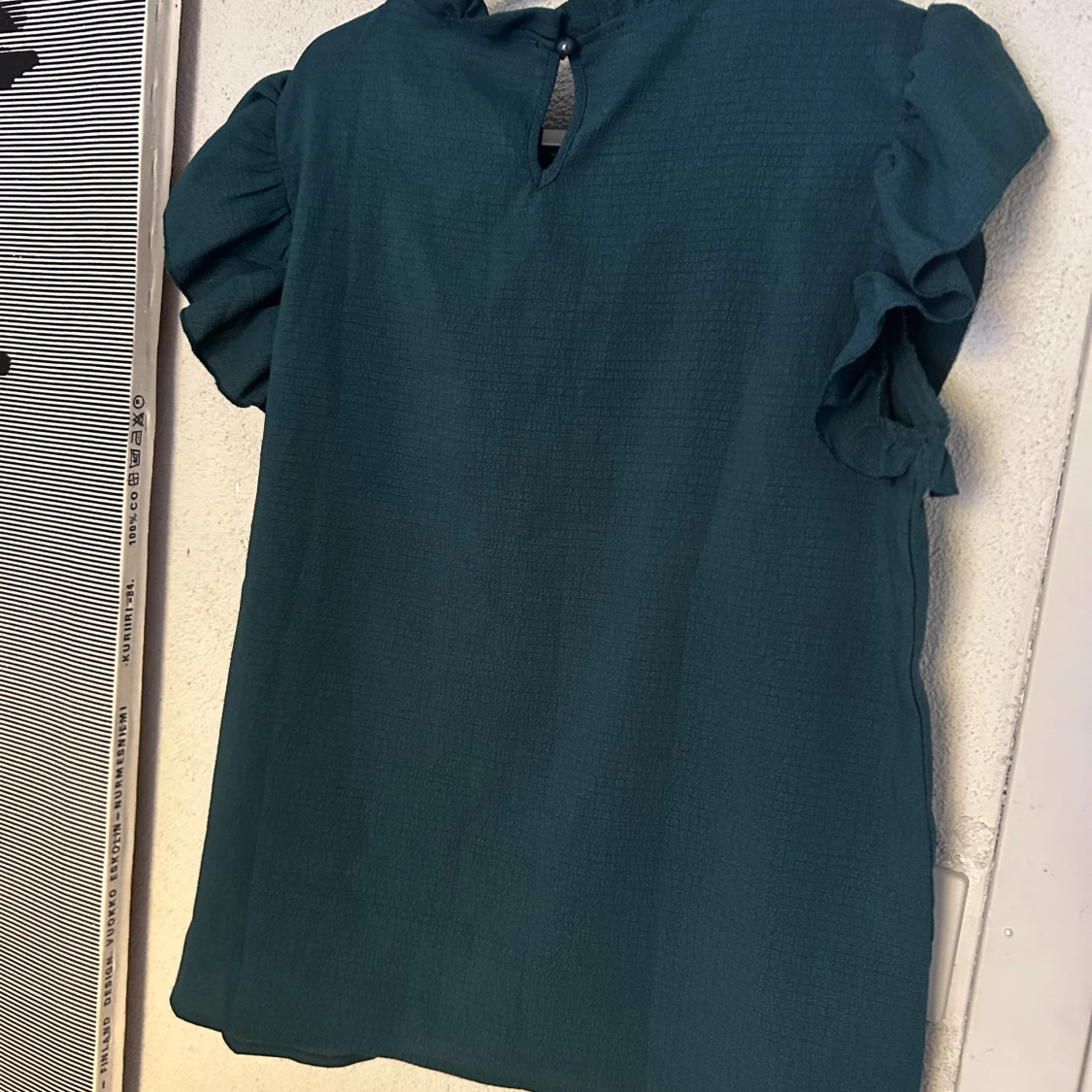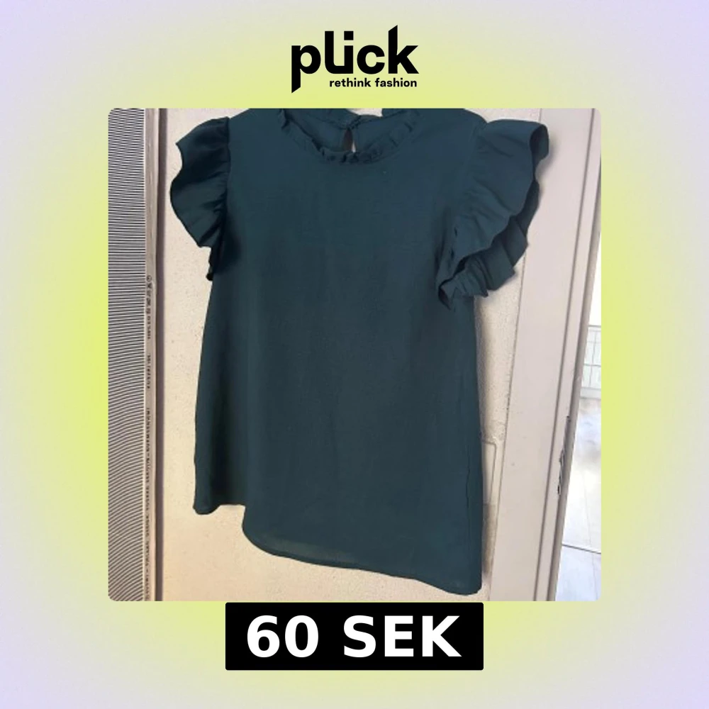 Supersöt mörkgrön blus med volangdetaljer på ärmarna och liten volang vid halsringningen. Blusen har en rak passform och knäpps med en knapp i nacken. Perfekt för dig som gillar en feminin och trendig stil.