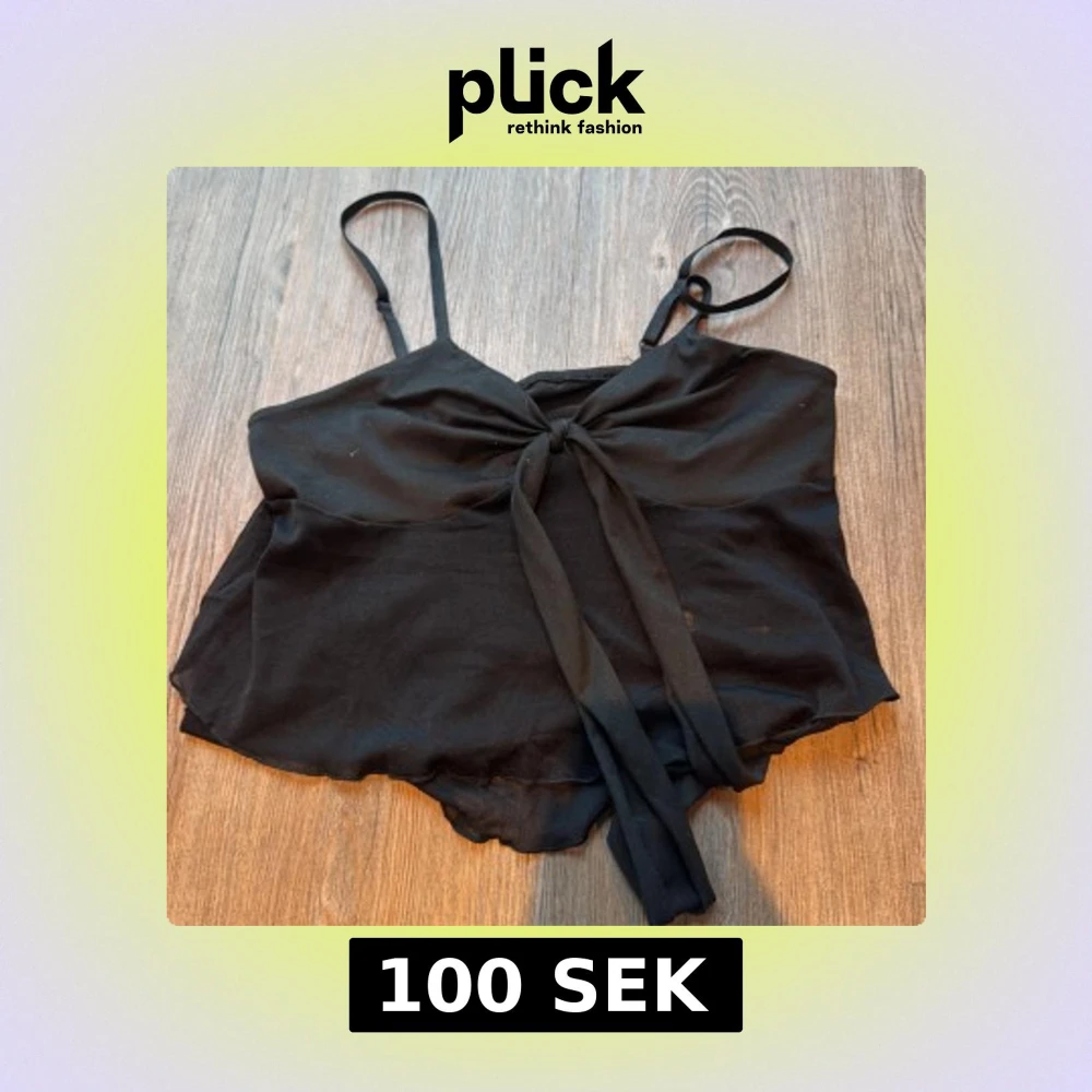Svart linnetopp från Romwe med tunna justerbara axelband och snygg knytning framtill. Toppen har en lätt vågig nederkant och är tillverkad i ett tunt, luftigt syntetmaterial som känns skönt mot huden. Perfekt för att skapa en chill och trendig look.
