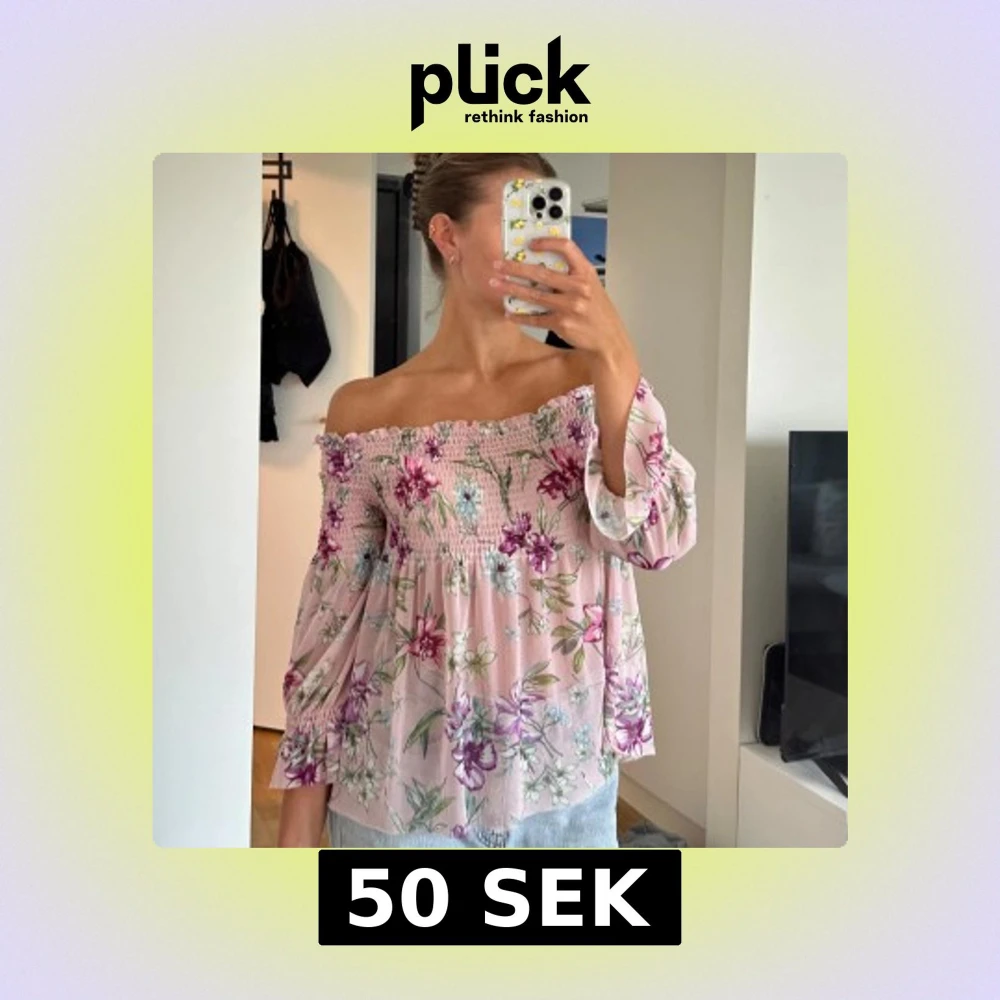 Supersöt blommig offshoulder blus från Amisu i ljusrosa med lila, gröna och vita blommor. Smockad upptill och vid ärmslut, vida trekvartsärmar och flowy passform. Perfekt för en somrig och romantisk look.
