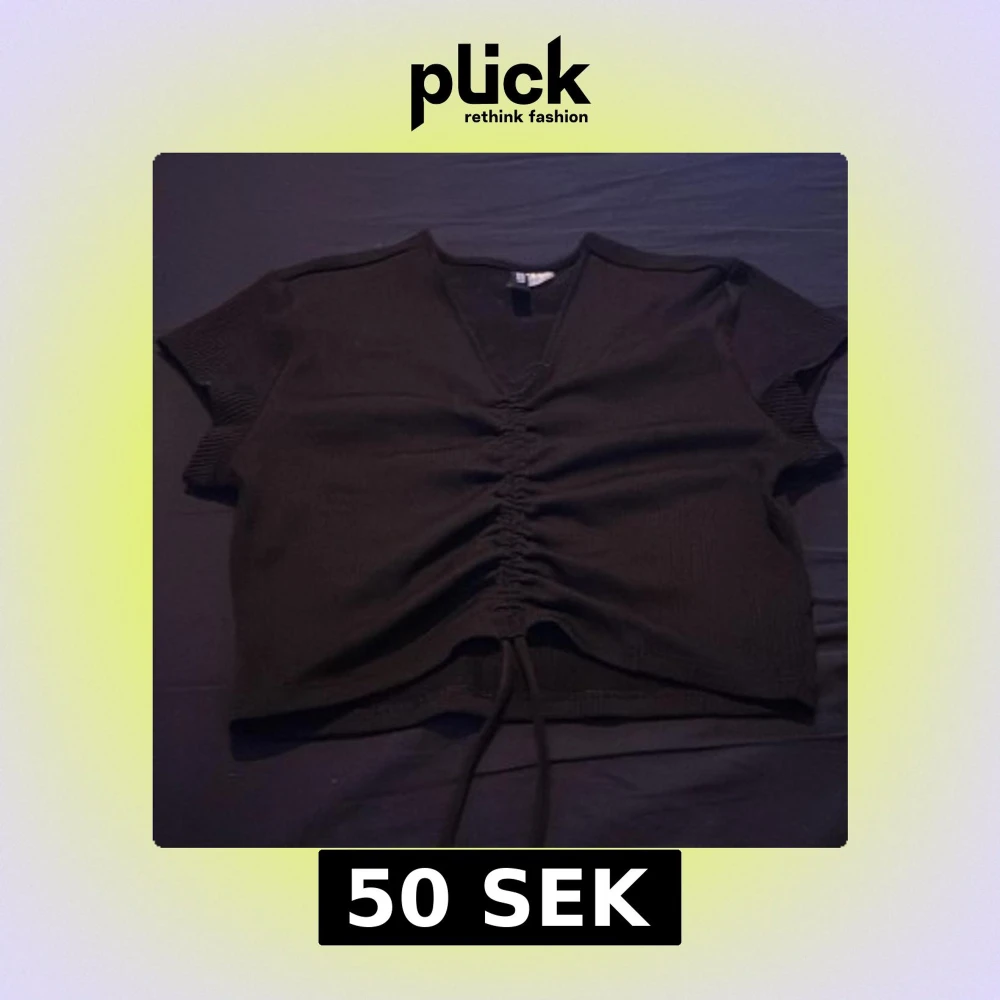 Svart ribbad topp från H&M Divided i storlek M passar även som S. Toppen har korta ärmar, v-ringning och snygg snörning framtill som ger en cool rynkad effekt. Materialet är stretchigt och består av 95% polyester och 5% elastan. Perfekt för dig som gillar trendiga detaljer.