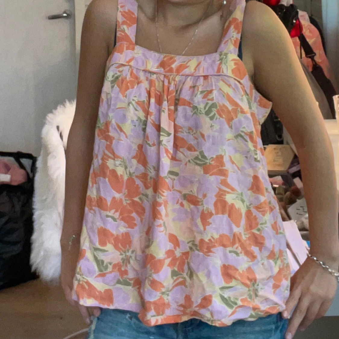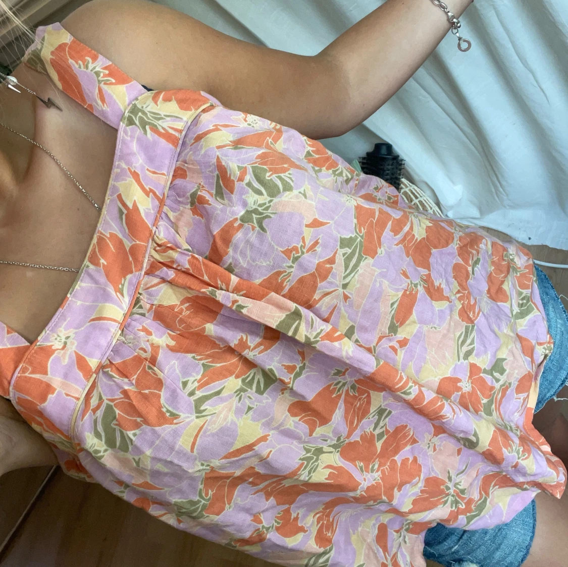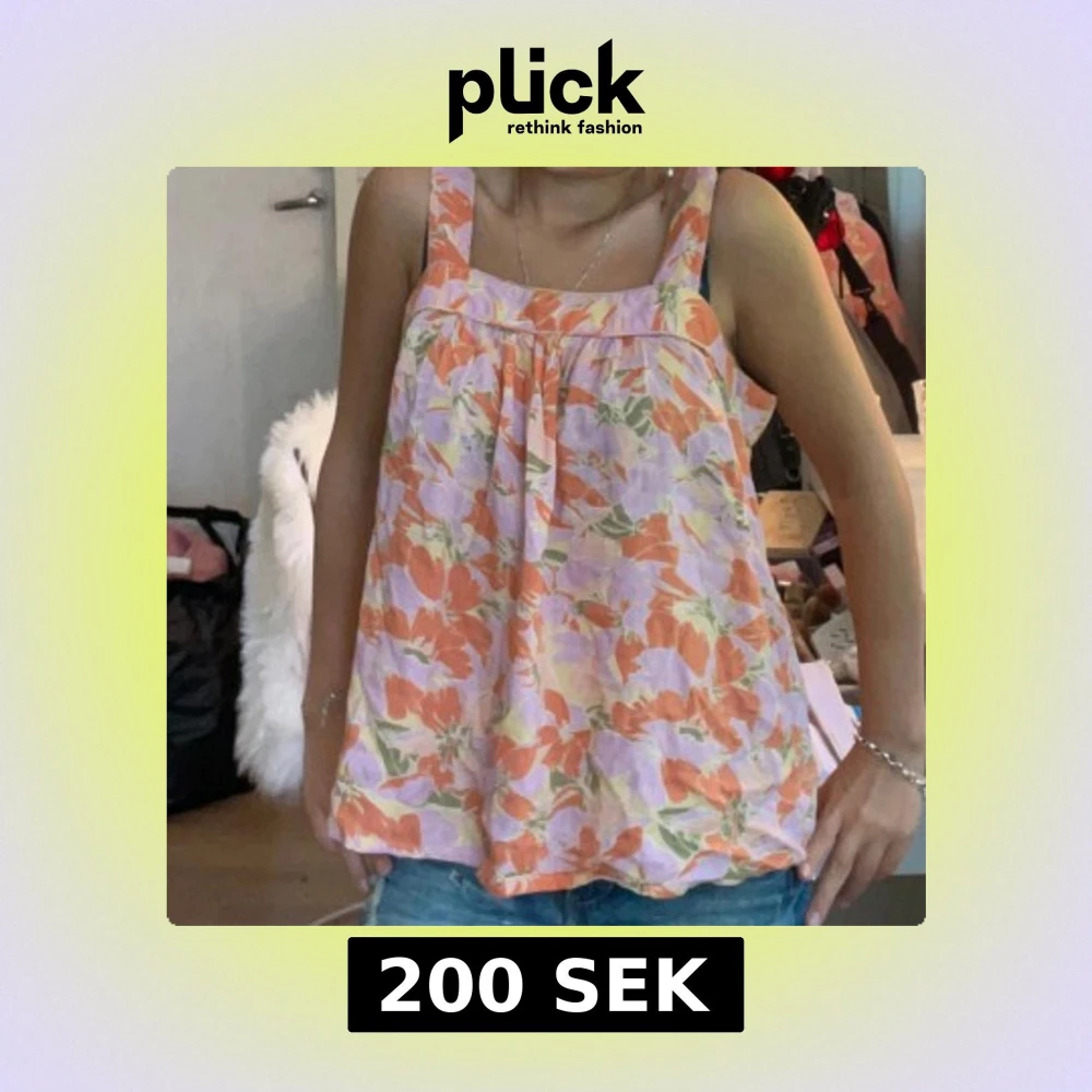 Supersöt linnetopp med breda axelband och blommigt mönster i orange, lila, grönt och lite gult. Luftig och flowy passform, perfekt för varma dagar. Toppens material känns lätt och svalkande, och färgerna ger en riktigt somrig vibe.