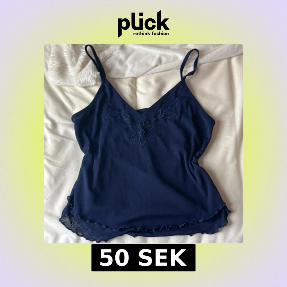 Säljer en mörkblå linnetopp med smala axelband och broderad blomma framtill. Toppen har volangkant nertill och är perfekt för varma dagar.