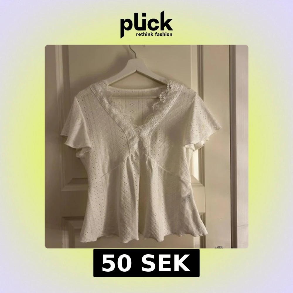 Charmig vit blus med v-ringning och spetsdetaljer. Blusen har korta ärmar och ett fint hålmönster som ger en romantisk känsla. Perfekt för varmare dagar.