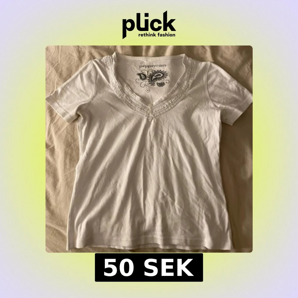 Säljer en vit topp från Pepper.com med v-ringning och fina spetsdetaljer runt halsen. Toppen har korta ärmar och är perfekt för en stilren look.
