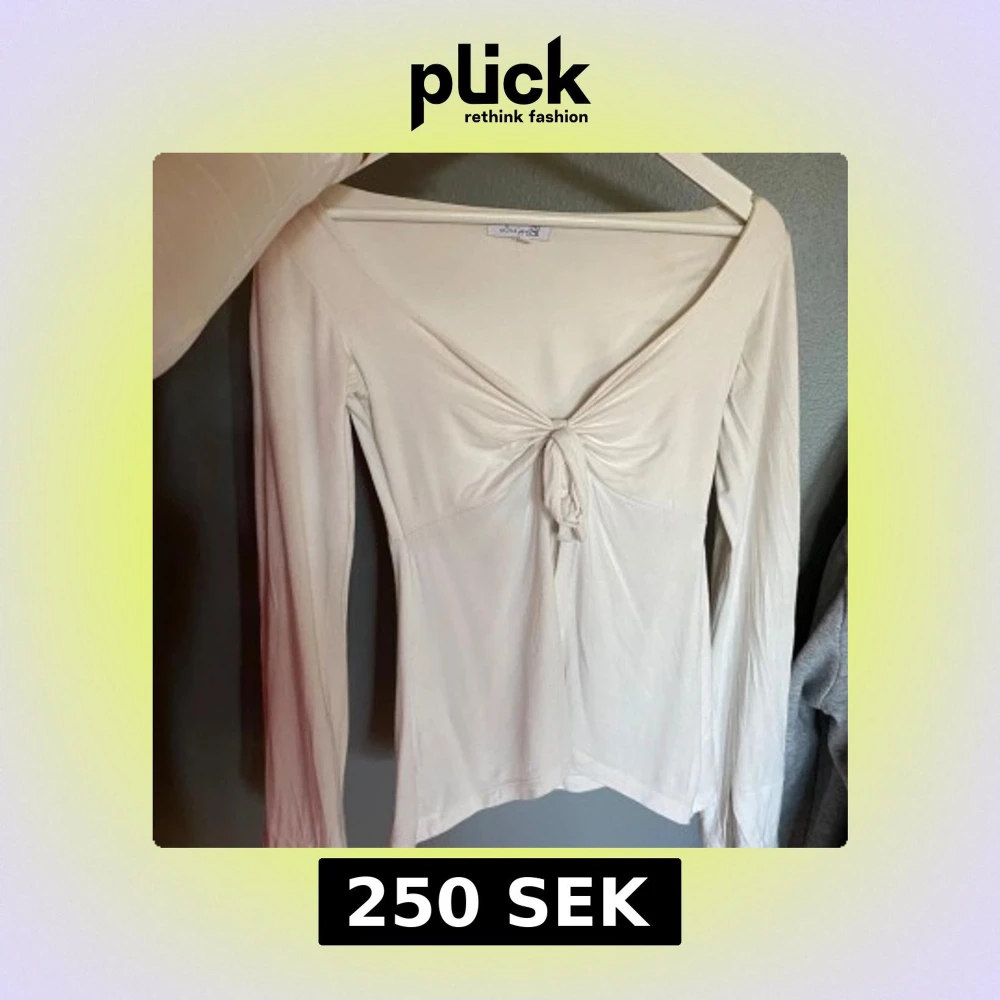 Superfin vit långärmad topp från Design by Si. Djup v-ringning och snygg knytdetalj framtill som ger en tusch. Perfekt att styla med jeans eller kjol för en clean look. Den passar mig som brukar oftast använda storlek xs/s! Den är lite beige då det blivit så i tvätten men ändå vit.