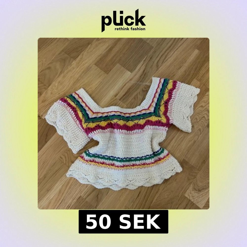 Superfin virkad topp i offwhite med färgglada ränder i rosa, blått, gult och grönt. Toppen har korta ärmar med vågig kant och en bred, rundad halsringning. Perfekt för sommarens alla tillfällen!