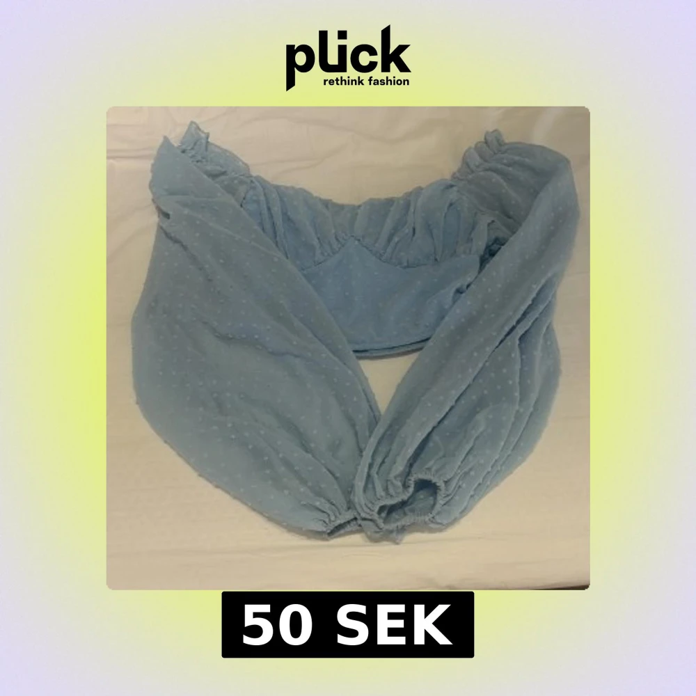 Supersöt ljusblå croppad topp från SHEIN med offshoulder och långa puffärmar. Tunt, lätt material med små broderade prickar och resår vid ärmslut och axlar. Perfekt för dig som vill ha en romantisk och trendig look.