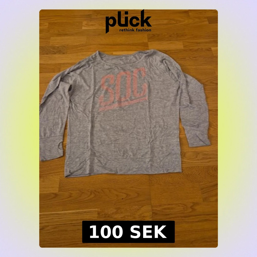 En grå långärmad topp från SOC med stort rosa tryck på bröstet. Tröjan har en avslappnad passform, bred halsringning och är tillverkad i ett mjukt, tunt material som känns skönt mot huden. Perfekt för en chill och sportig look.