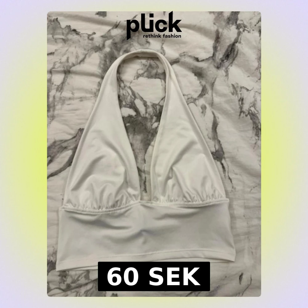 Säljer en vit halterneck topp från H&M Divided i storlek M. Toppen har en djup urringning och bred resår under bysten för extra stöd. Tillverkad i mjukt och stretchigt material som känns skönt mot huden. Perfekt till sommaren och enkel att styla.