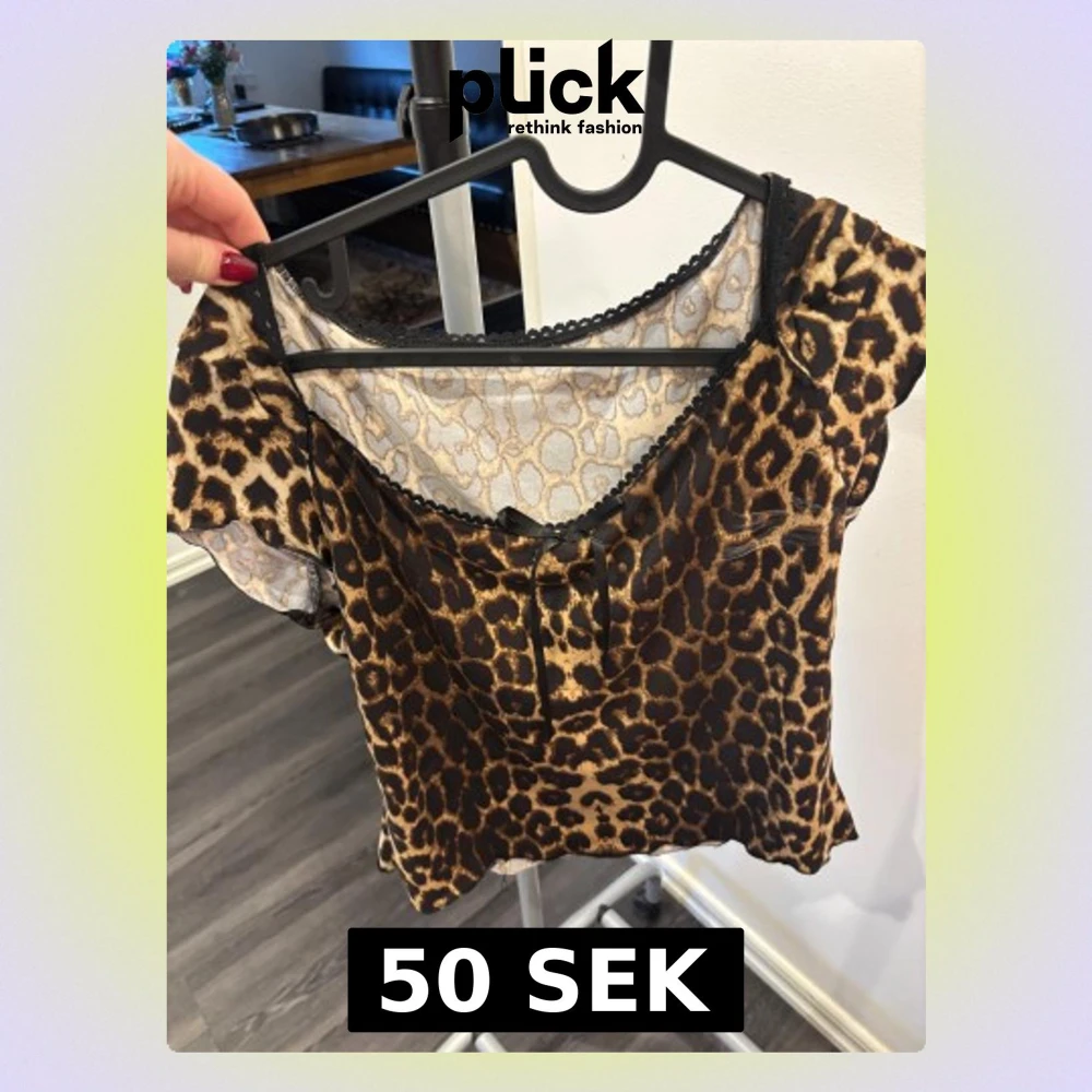 Säljer en kortärmad blus med leopardmönster i bruna och beige toner. Toppen har en söt liten svart rosett framtill och spetskant vid halsringningen. Materialet är glansigt och känns lätt mot huden, perfekt för dig som gillar att sticka ut.