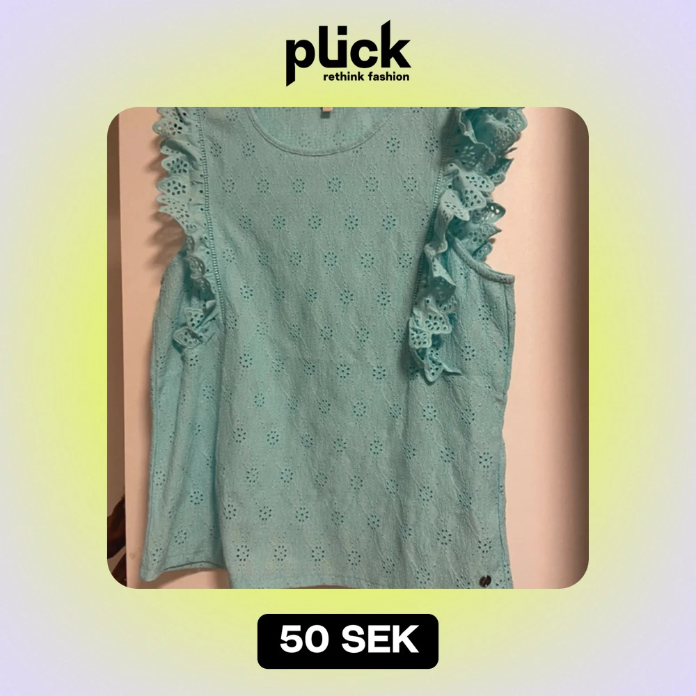Säljer en söt turkos ärmlös topp med vackra volangdetaljer längs armen. Toppen har ett fint broderat mönster som ger en romantisk känsla. Perfekt för sommardagar eller en avslappnad vårlook. Passar bra till både jeans och kjol! Endast använd 1 gång