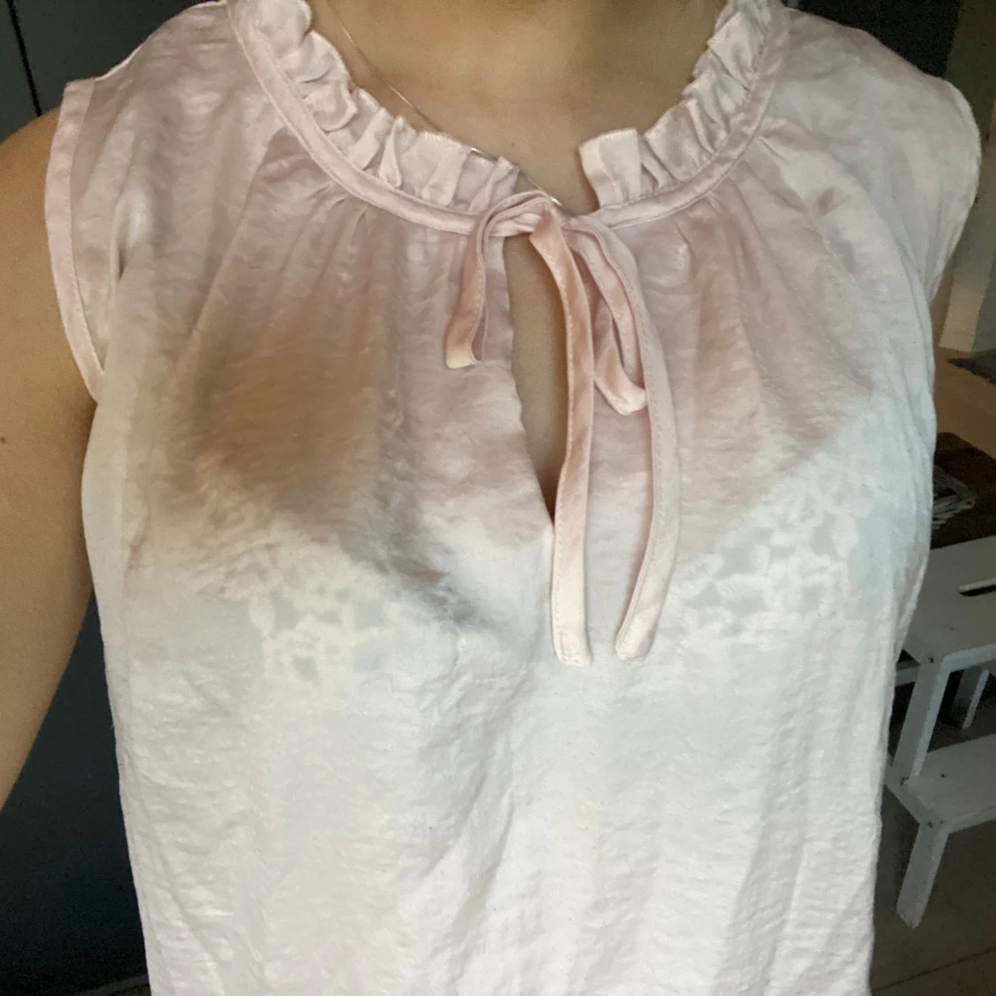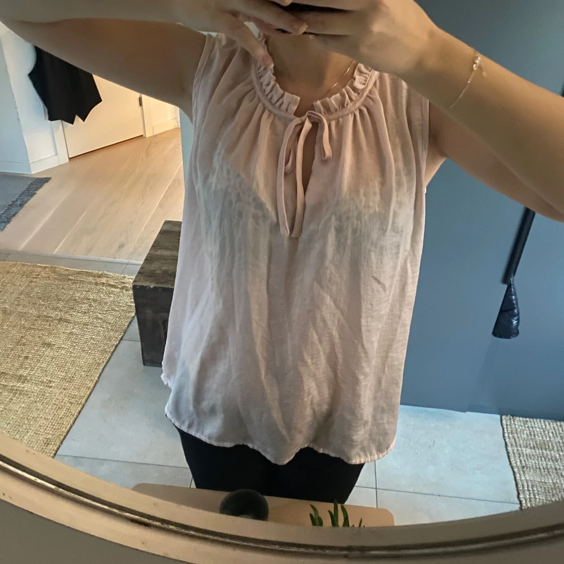 Säljer en söt ljusrosa ärmlös blus med knytband vid halsen. Blusen har en lätt och luftig design, perfekt för varmare dagar. Den har en volangdetalj runt halsringningen 💕💕