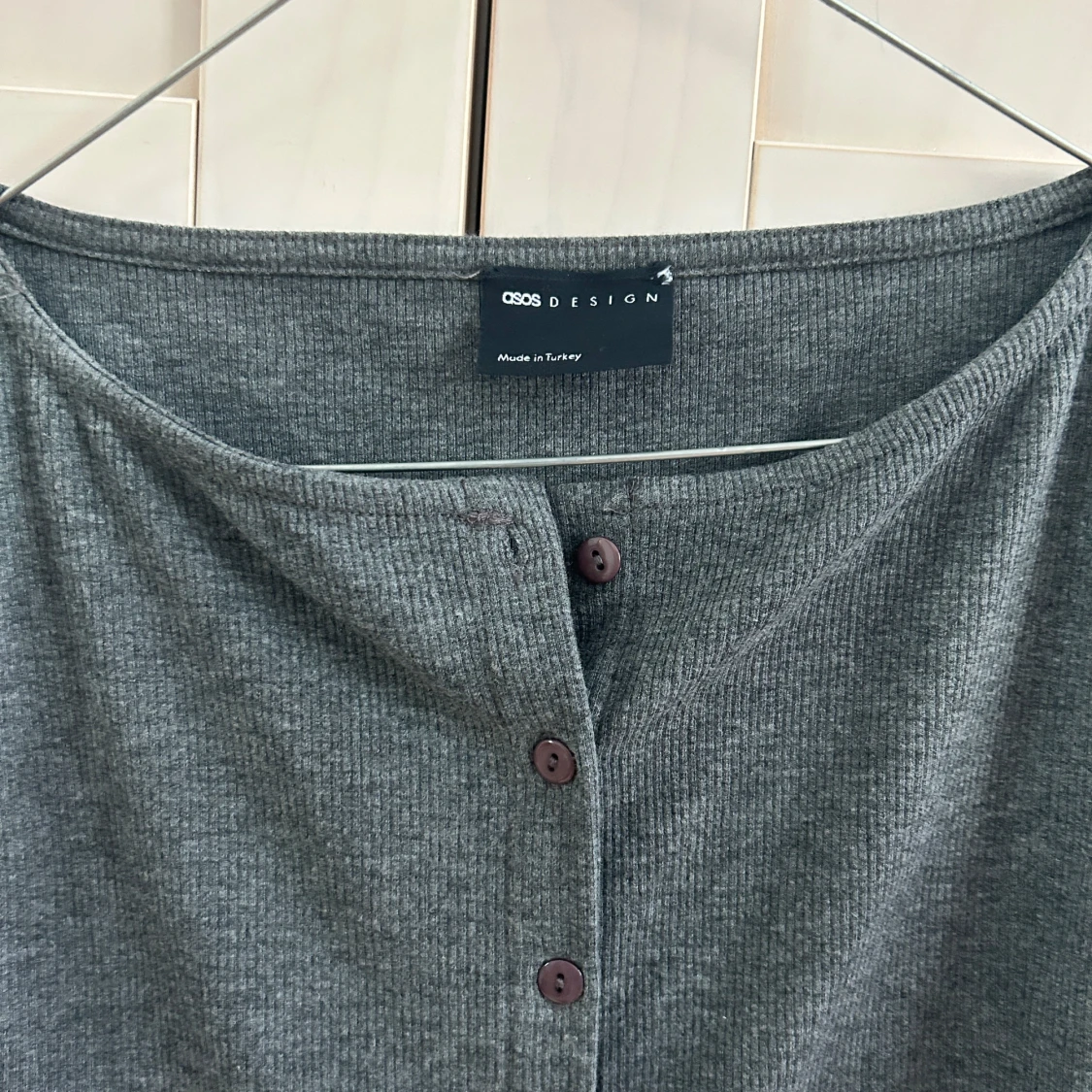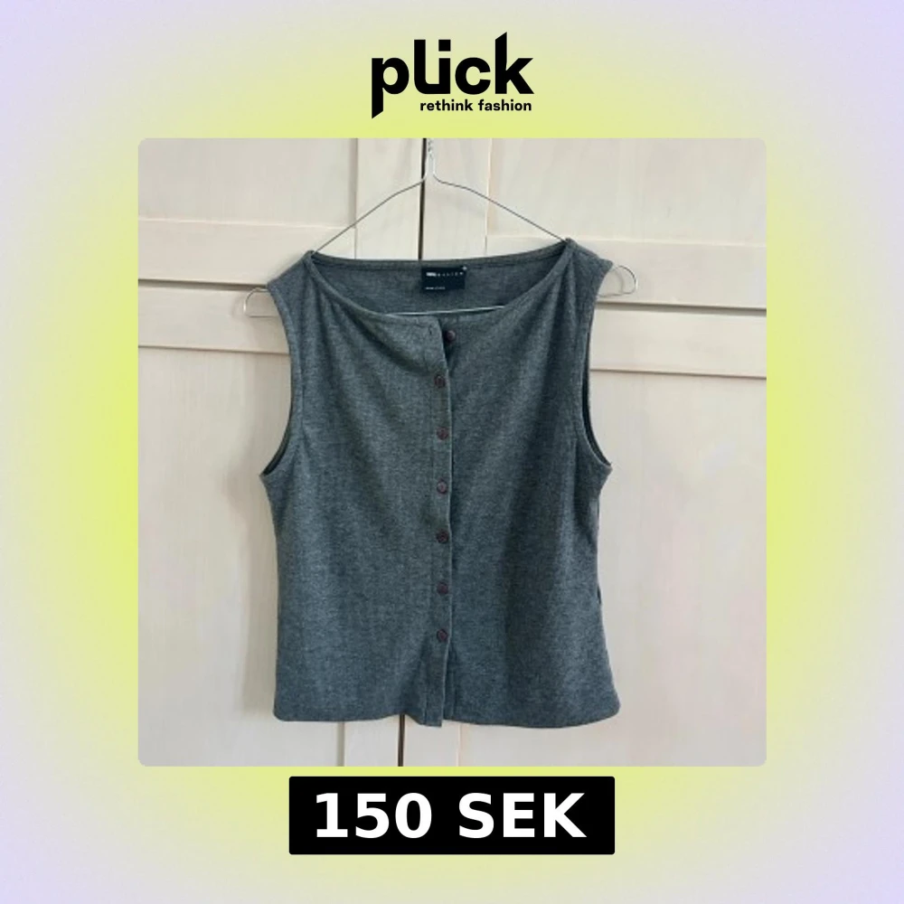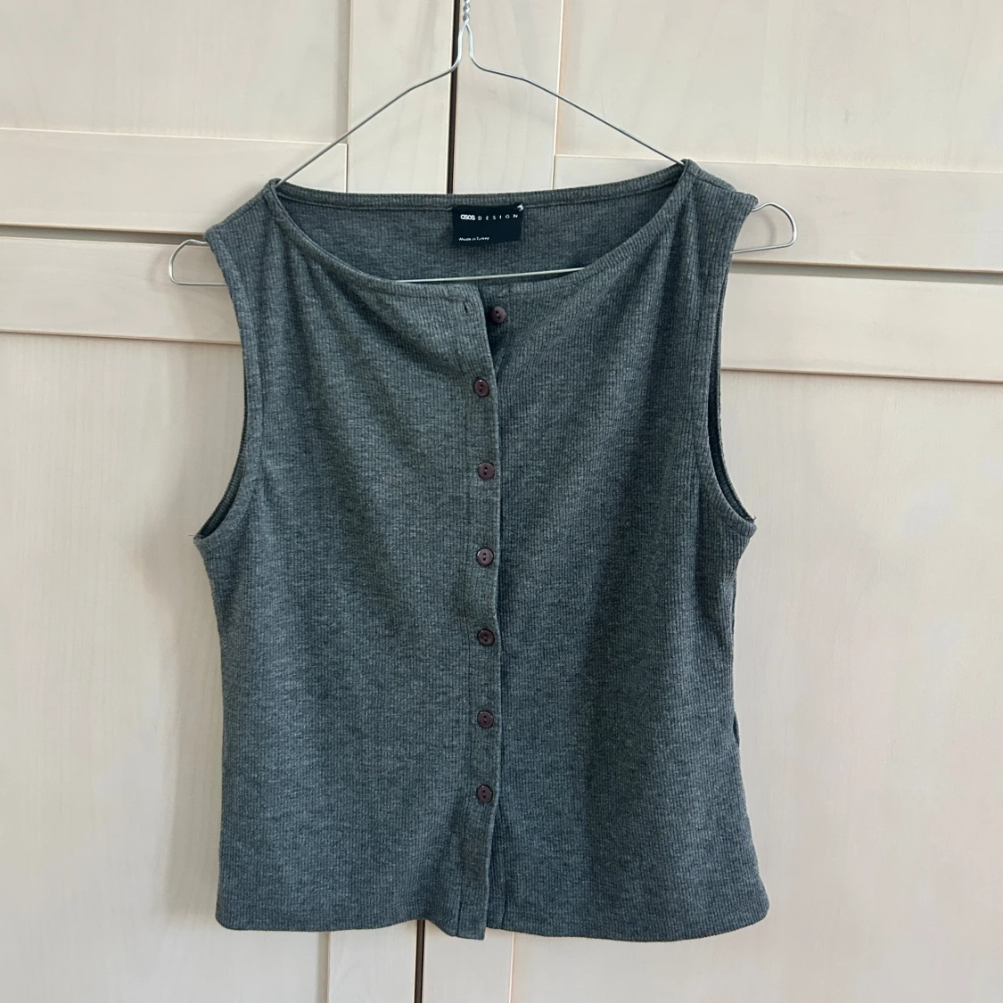 Säljer en grå ribbad linnetopp från ASOS DESIGN med knappar framtill. Toppen är ärmlös och har en enkel, rak passform. Perfekt att matcha med jeans eller kjol för en avslappnad look. Aldrig använt, ej genomskinlig, sticks ej