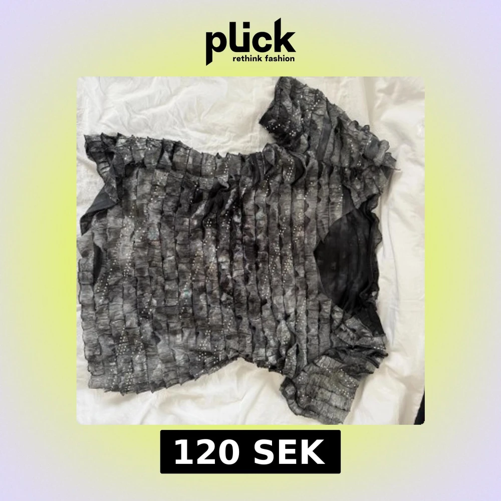 Säljer en unik svart blus med glittriga paljettdetaljer och volangiga lager över hela toppen. Blusen har korta ärmar och en lätt transparent känsla. Passar från S-L