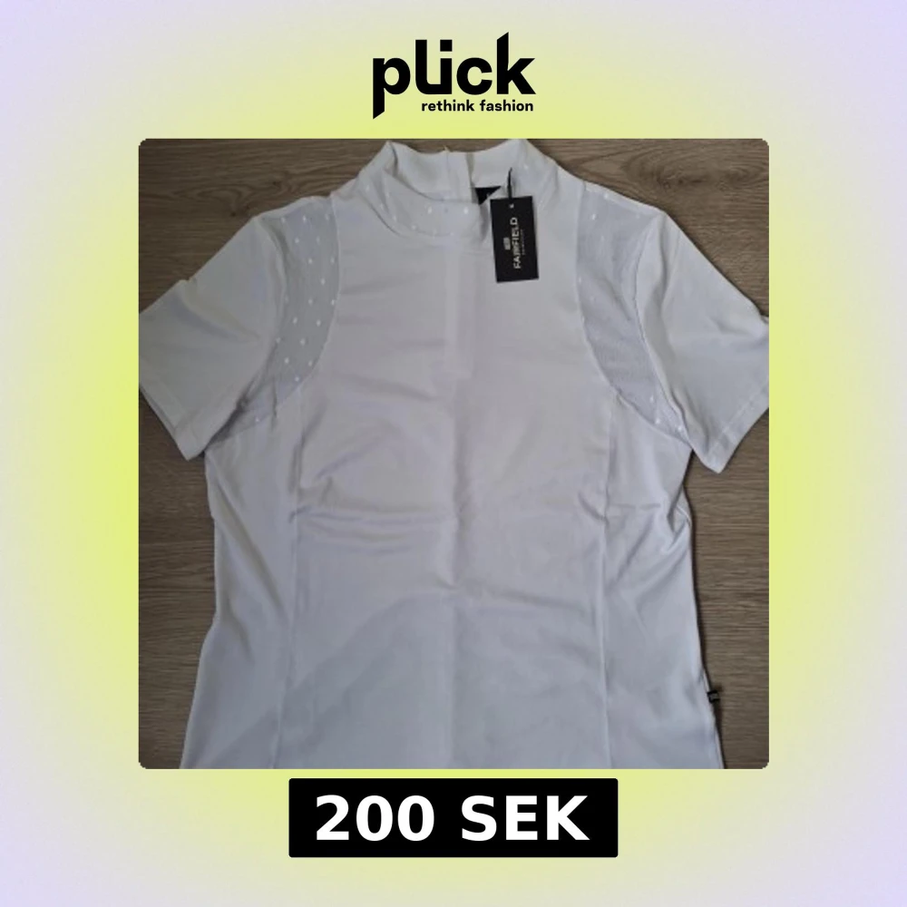 Snygg vit ridtopp från Fairfield Equestrian med korta ärmar och meshdetaljer med prickigt mönster på axlarna. Hög krage och stilren design, perfekt för dig som gillar hästar och vill ha en sportig look. Materialet är mjukt och följsamt. Stl M. Lappen kvar och aldrig använd och skickas i orginalförpackning!