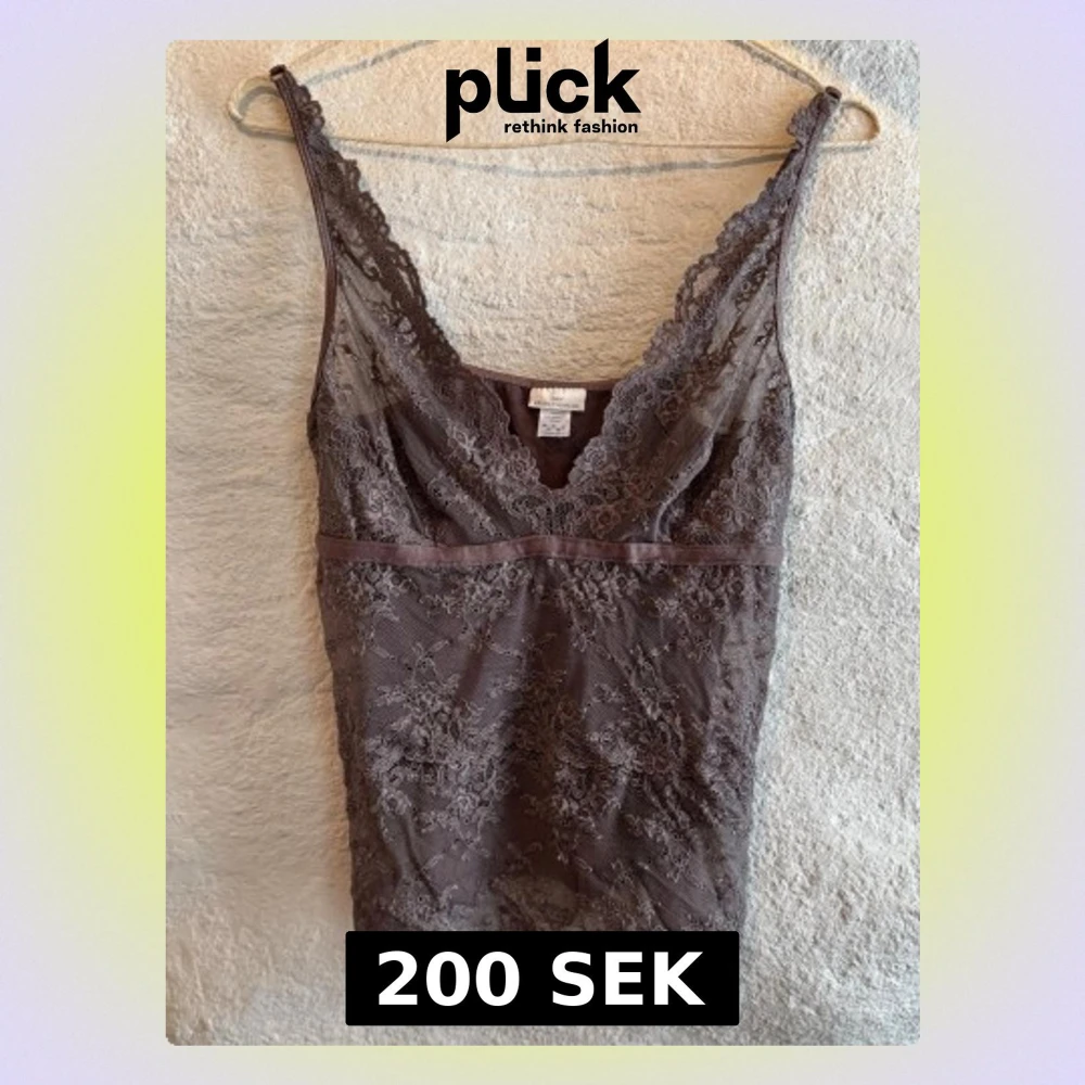 Säljer en brun super fin linnetopp från DAY Birger et Mikkelsen med vacker spets framtill och längs kanterna. Toppen är väldigt strechig vilket gör att den passar storlek S-L. Den har smala axelband som går att ljustera, v-ringning och transparent spetsdetalj över bröstet.
