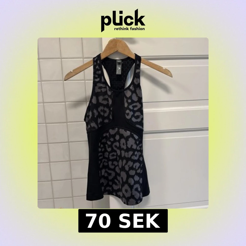 Snygg svart träningstopp från Adidas Stella McCartney med grått leopardmönster och sportig racerback. Toppen är ärmlös och tillverkad i ett stretchigt syntetmaterial som andas, perfekt för intensiva träningspass. Logga framtill och cool meshdetalj i ryggen 🥰