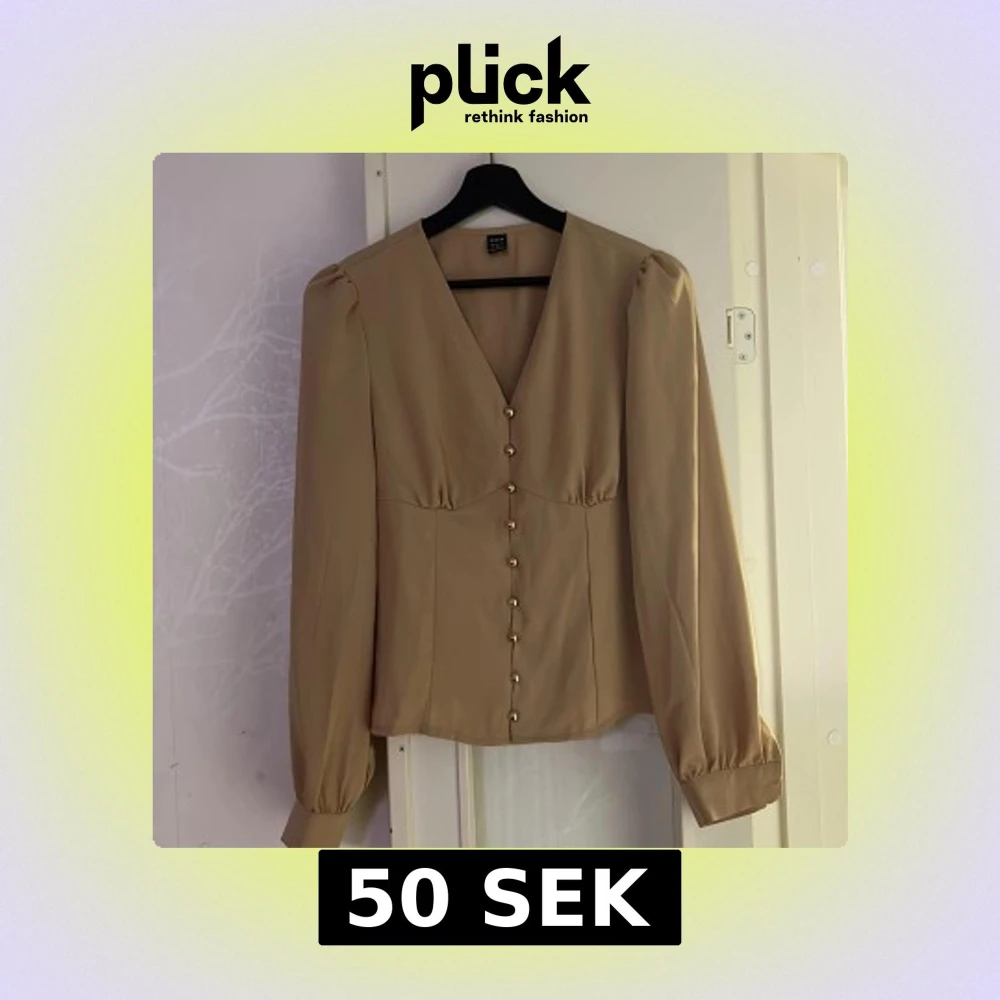 Säljer en elegant beige blus från Shein med v-ringning och dekorativa knappar framtill. Blusen har långa ärmar med puffiga axlar och en figursydd passform. Perfekt för en stilren look.