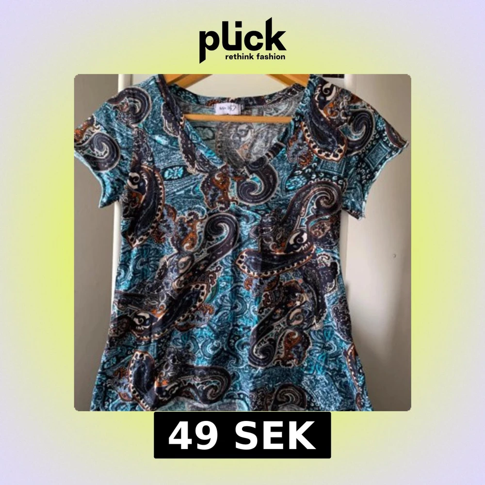 Säljer en färgglad topp från Monki med ett livligt paisleymönster i blått, orange och svart. Toppen har en v-ringad hals och korta ärmar, perfekt för en avslappnad stil.
