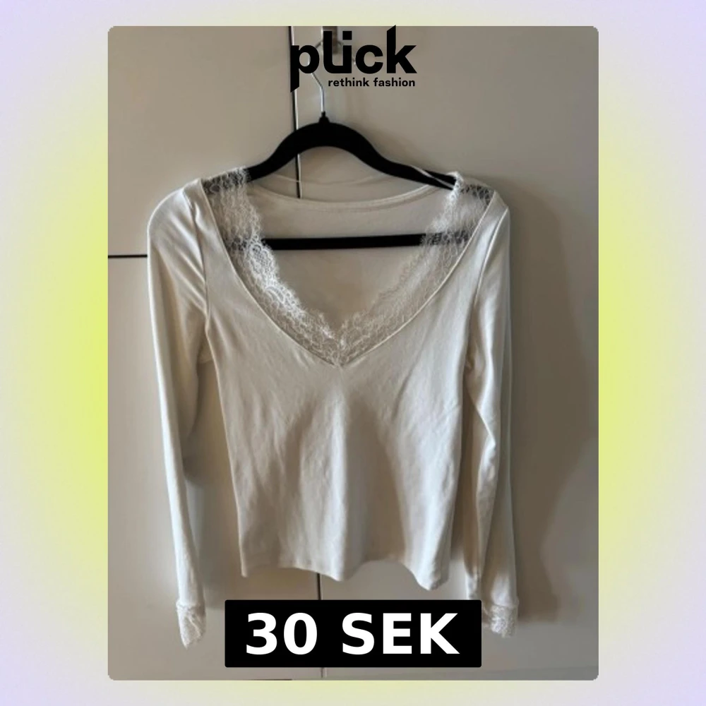 Snygg vit långärmad topp med djup v-ringning och spetsdetaljer vid halsringningen och ärmsluten.