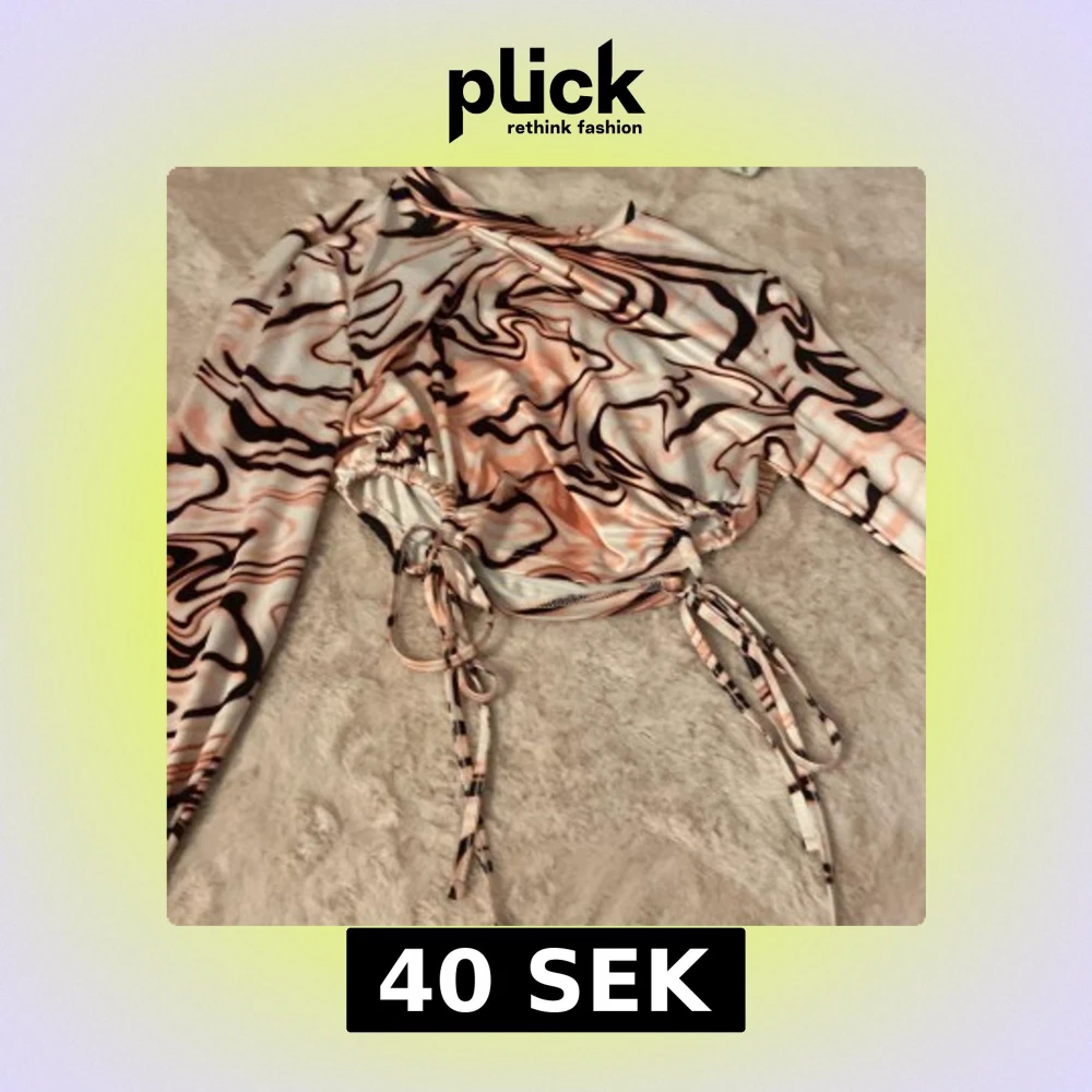 Trendig långärmad croppad topp med swirlmönster i rosa, svart och beige. Toppen har snygga snörningsdetaljer på sidorna som gör att du kan justera passformen. Tillverkad i ett stretchigt syntetmaterial som sitter skönt på kroppen.