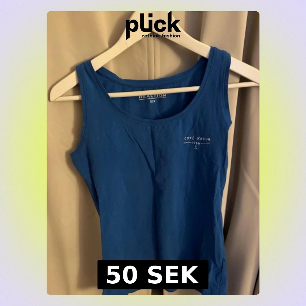 Snygg blå linnetopp från Reaction med tryck 'Côte d'Azur 1755' på bröstet. Toppen har rund halsringning och är ärmlös, Helt oanvänd men utan prislapp