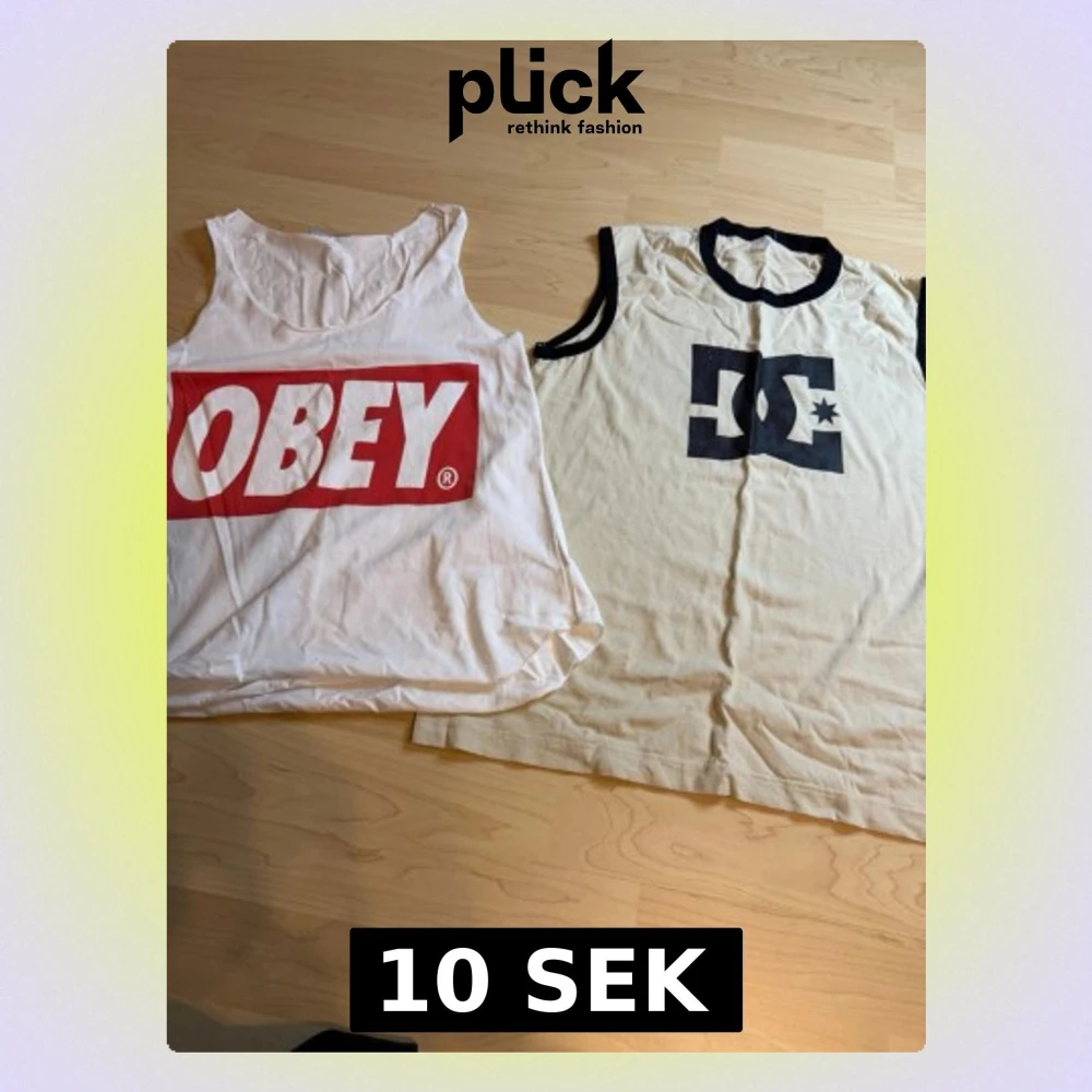 Två snygga linnetoppar, en från OBEY med stor röd logga framtill och en från DC med svart logga och svarta kontrastkanter. Båda är ärmlösa och har avslappnad passform, perfekta till sommaren eller streetwear-stilen.