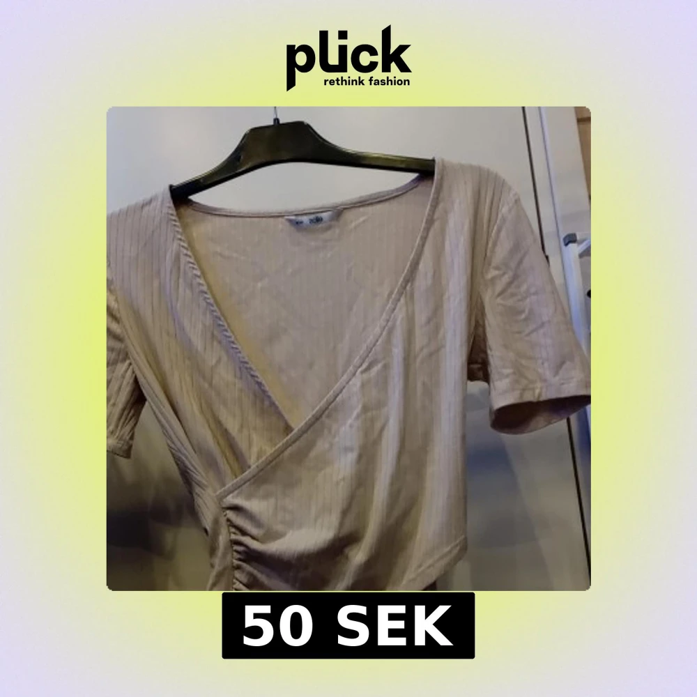 Snygg beige omlottopp från ELOS med korta ärmar och v-ringning. Toppen har ett diskret randigt mönster och lätt rynk vid sidan. Perfekt för dig som gillar en stilren och trendig look.