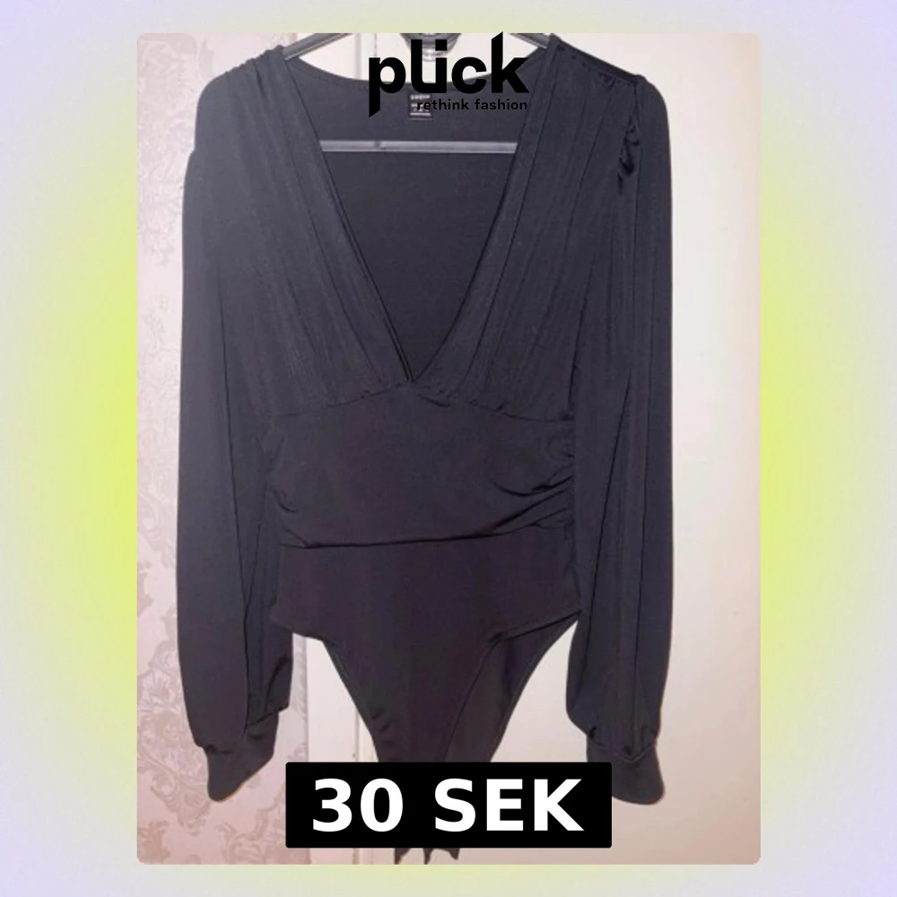 Säljer en svart body från Shein med djup v-ringning och omlottdetalj framtill. Långa ärmar med lätt puff och breda muddar. Stretchigt material som sitter snyggt på kroppen och ger en stilren look.