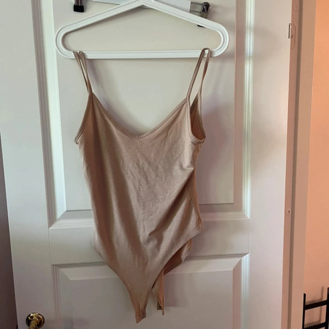 Snygg beige linnetopp i bodystyle med smala axelband och djup v-ringning. Perfekt att styla med jeans eller kjol för en clean look. Mjuk och stretchig bomull som sitter skönt mot kroppen.