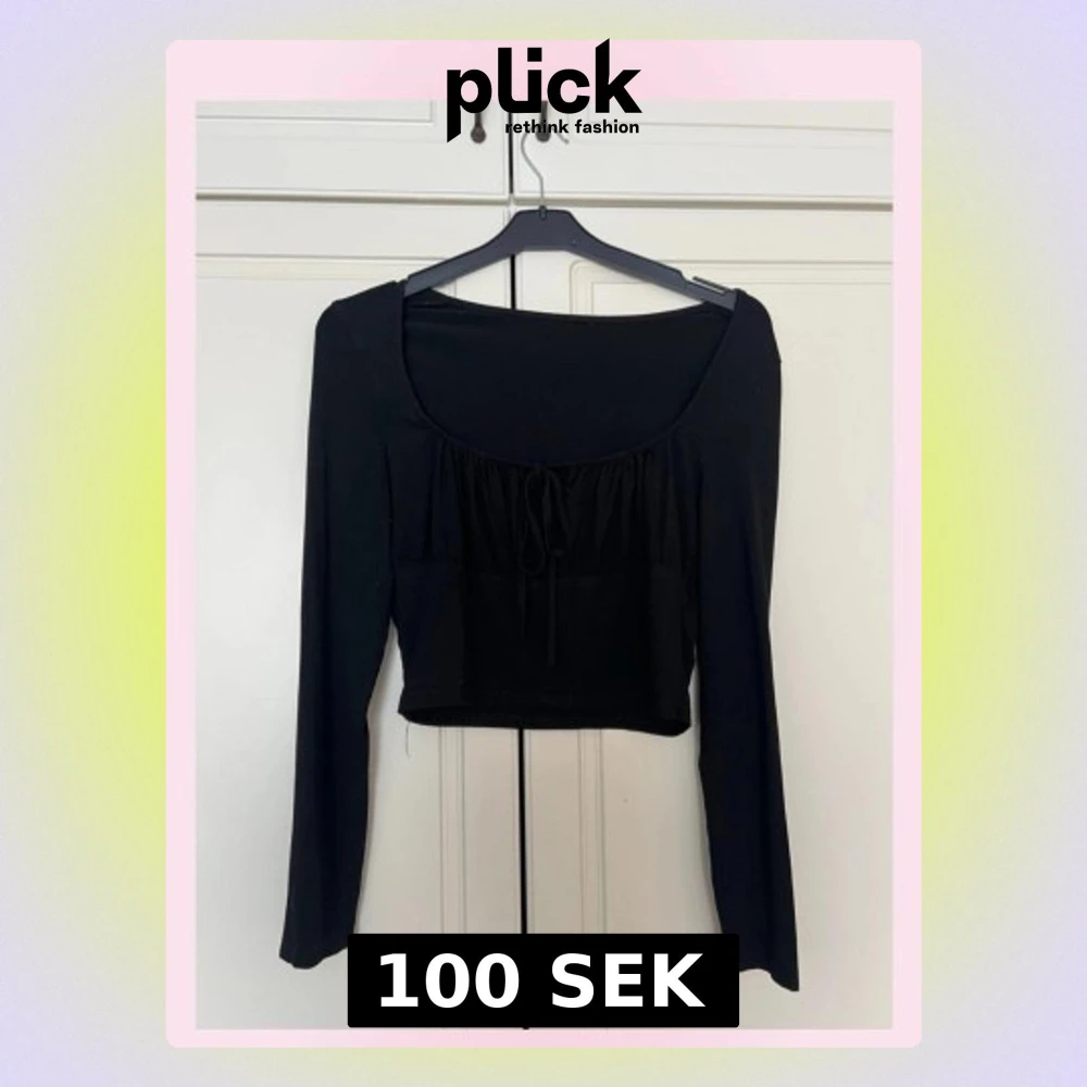 đSnygg svart croppad topp med lĂ„nga Ă€rmar och en djup, rundad urringning. Toppen har en söt snörningsdetalj framtill som ger extra stilpoĂ€ng. Perfekt att matcha med höga jeans eller kjol för en trendig look. VĂ€ldigt stretchig och mjuk !đ