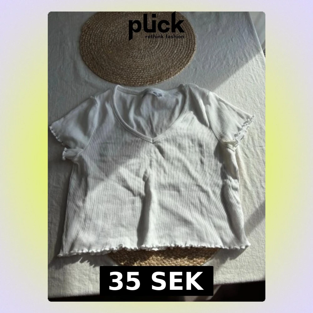 Säljer en vit ribbad croppad topp med v-ringning och korta ärmar. Toppen har vågiga kanter vid ärmslut och nederkant för en söt touch. Perfekt till jeans eller kjol för en enkel men snygg look. Storlek M
