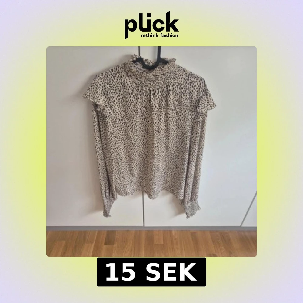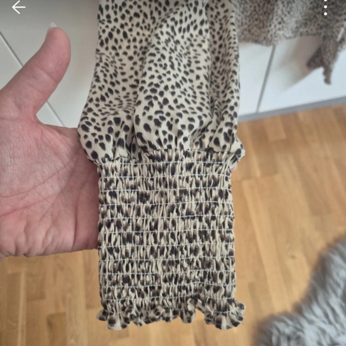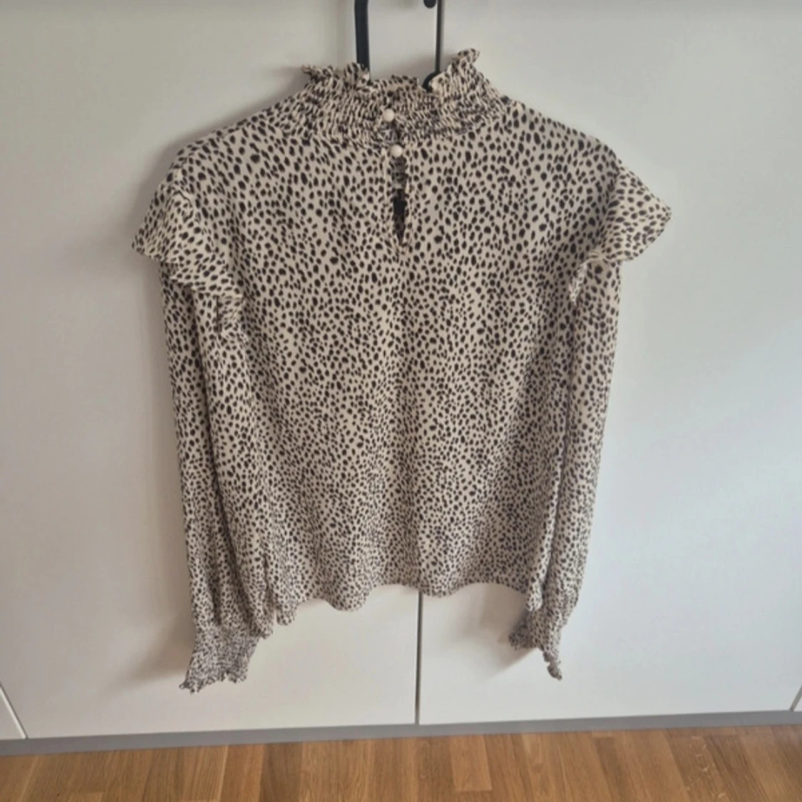 Supersnygg beige blus med svart leopardmönster, hög smockad krage och långa ärmar med breda smockade muddar. Blusen har volangdetaljer vid axlarna och knäppning bak i nacken. Perfekt för dig som gillar trendiga och unika plagg.