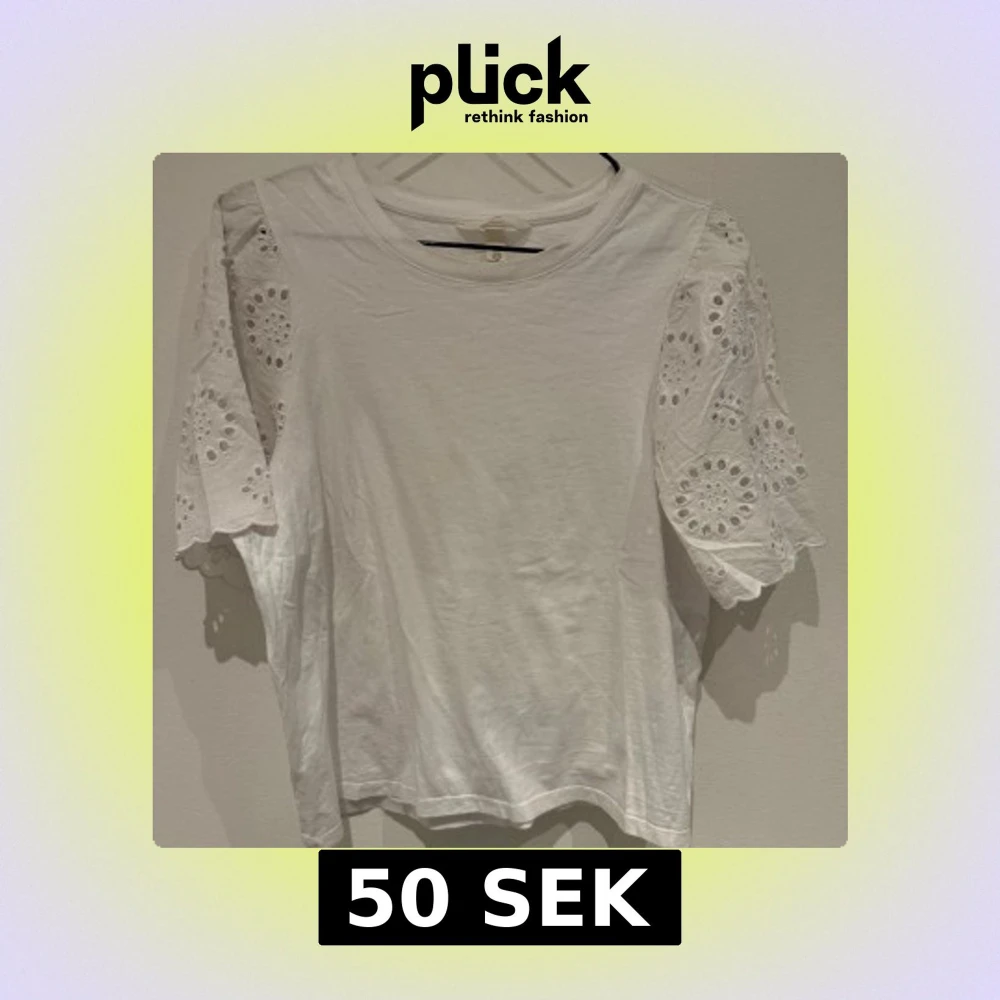 Säljer en vit topp med korta puffärmar i broderad bomull med hålmönster. Toppen har rund halsringning och är i mjukt material. Perfekt för en fräsch och söt look!