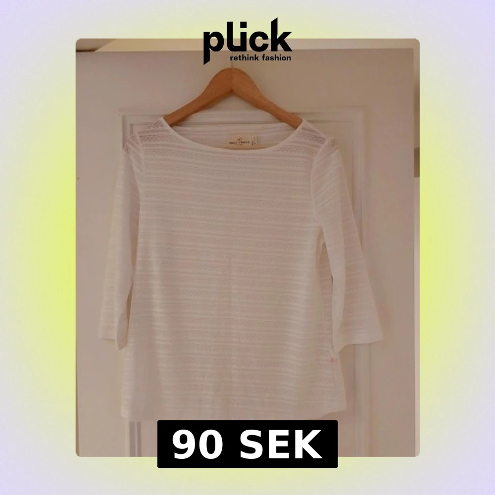 Säljer en vit blus från Holly & Whyte med snygga spetsdetaljer och diskret randigt mönster. Blusen har trekvartsärm och rund halsringning. Materialet är mjukt och lätt, perfekt för vår och sommar. Passar dig som gillar stilrena och fräscha toppar.