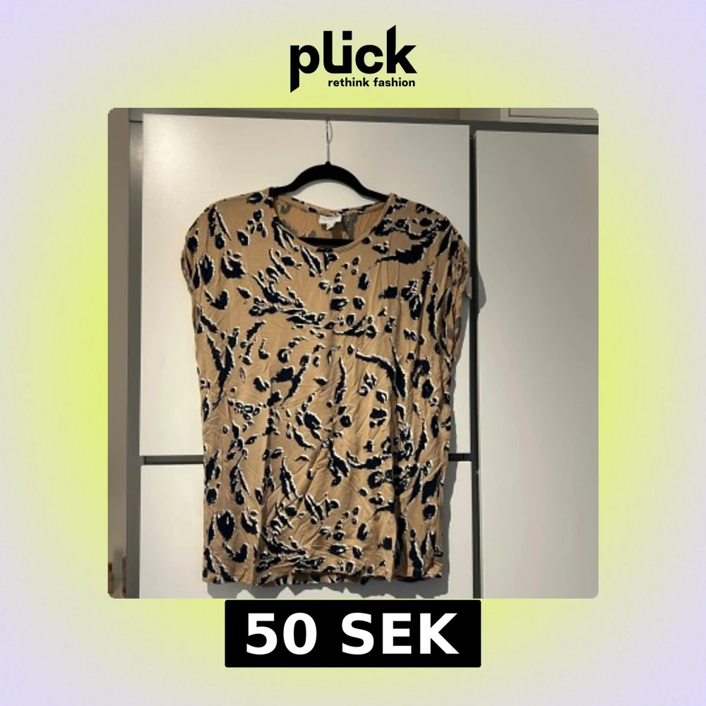 Snygg beige topp med leopardmönster i svart och vitt. Toppen har en rund halsringning och korta ärmar.