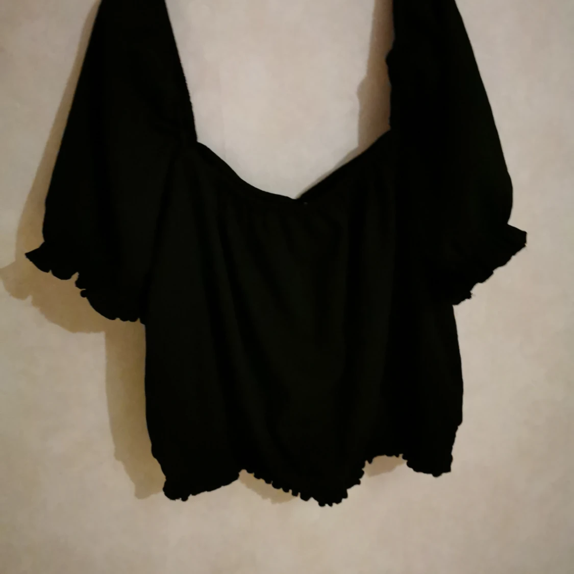 Svart croppad långärmad topp - Snygg svart croppad topp med lång ärm och fyrkantig urringning. Toppen har en hög hals som ger en cool och trendig look. Perfekt att styla med jeans eller kjol för en modern outfit.