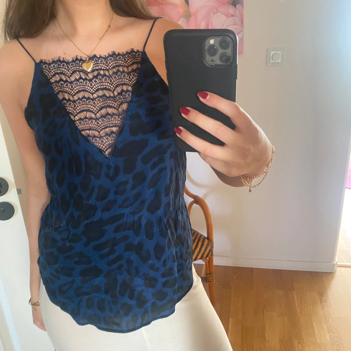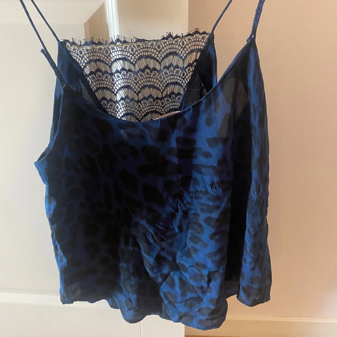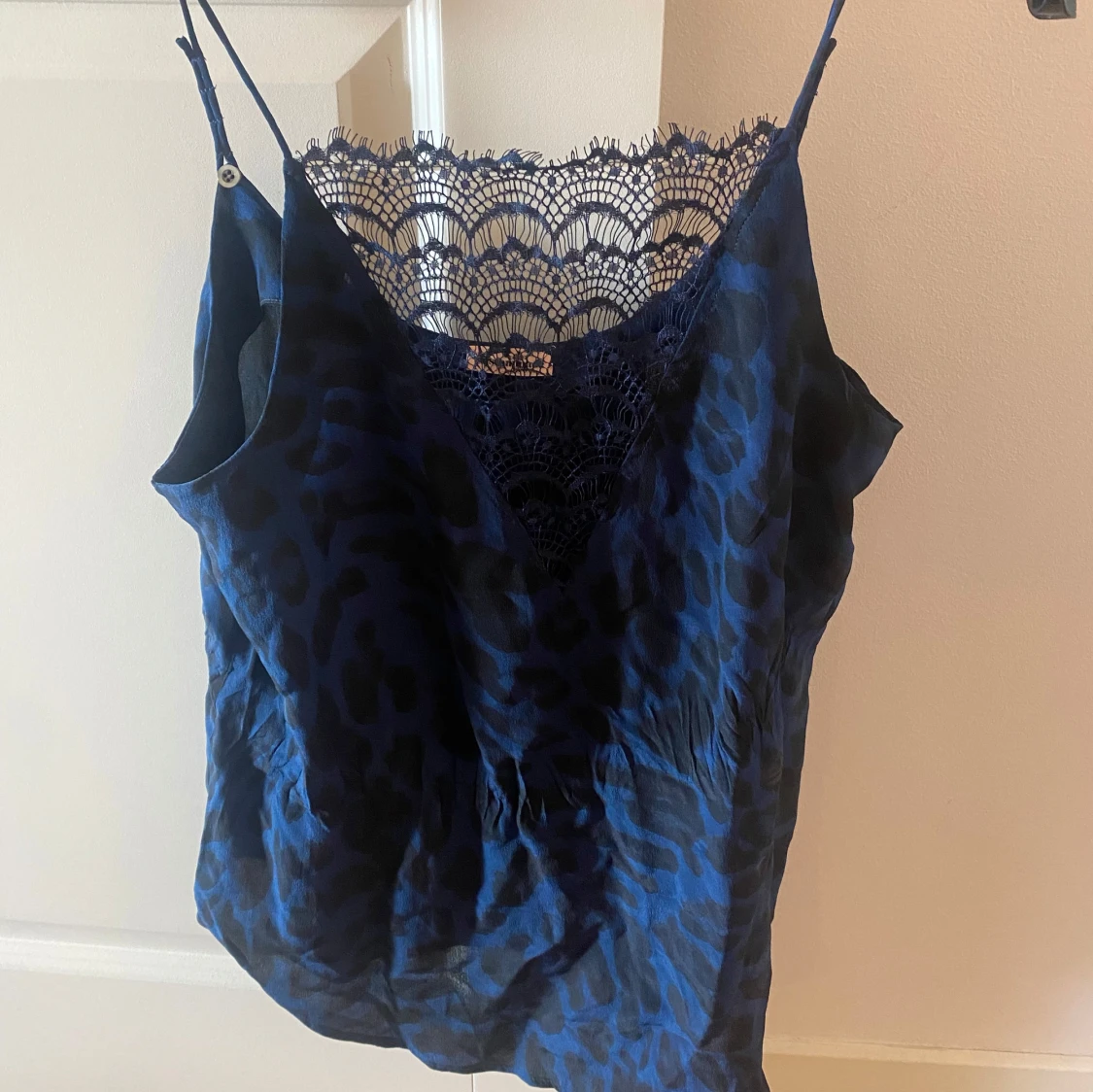 Snygg blå linne med leopardmönster och vacker spetsdetalj vid halsringningen. Tunna axelband och en luftig passform gör den perfekt för varma dagar. Ett stilrent plagg som enkelt kan kläs upp eller ner beroende på tillfälle.