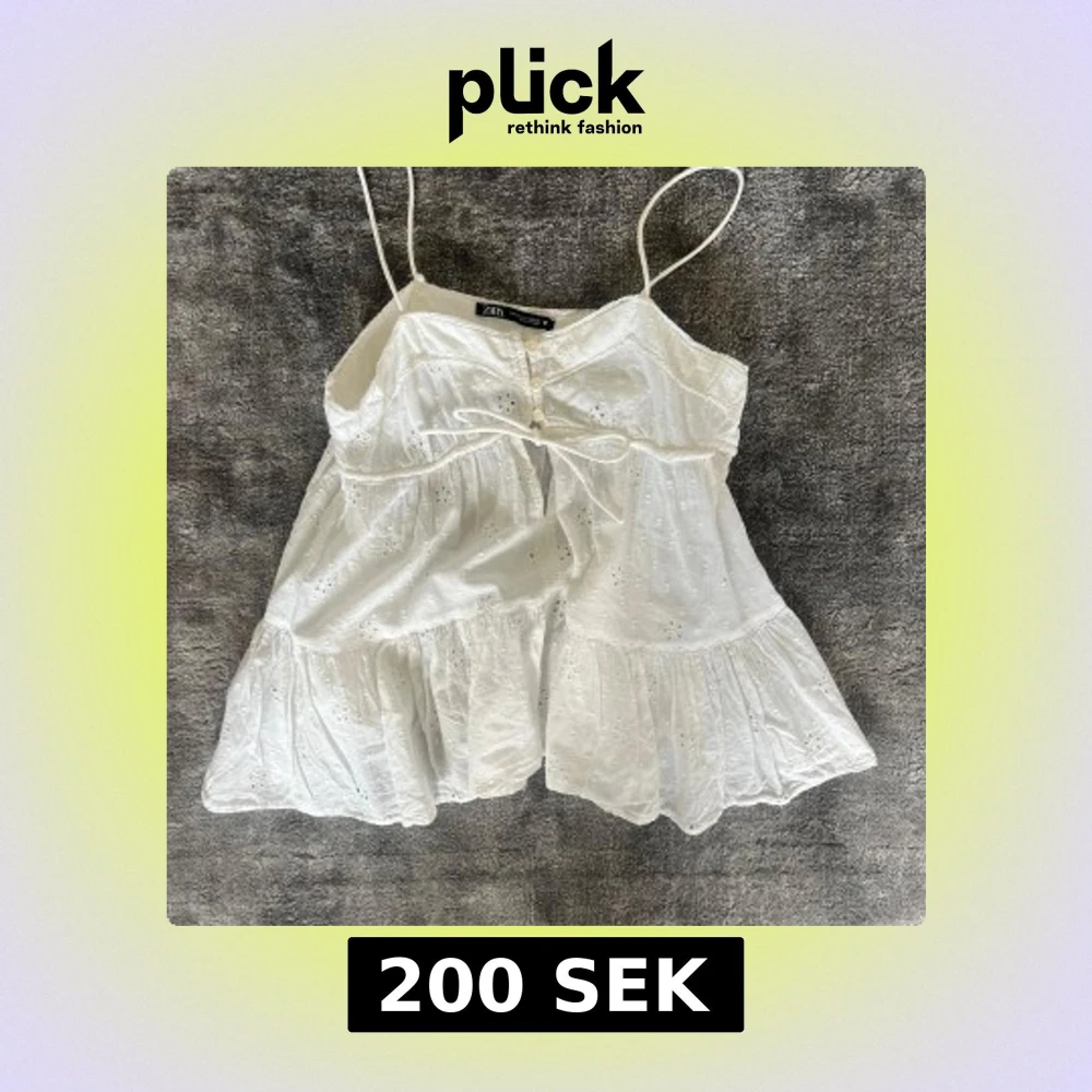 Säljer en söt vit linnetopp från Zara med broderade detaljer och tunna axelband. Toppen har volang nertill och en liten knytning framtill. 😍😍aldrig använd