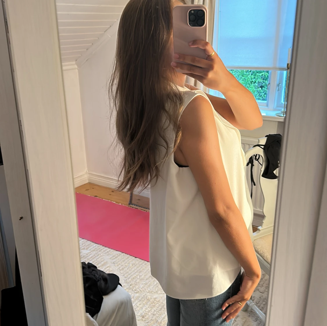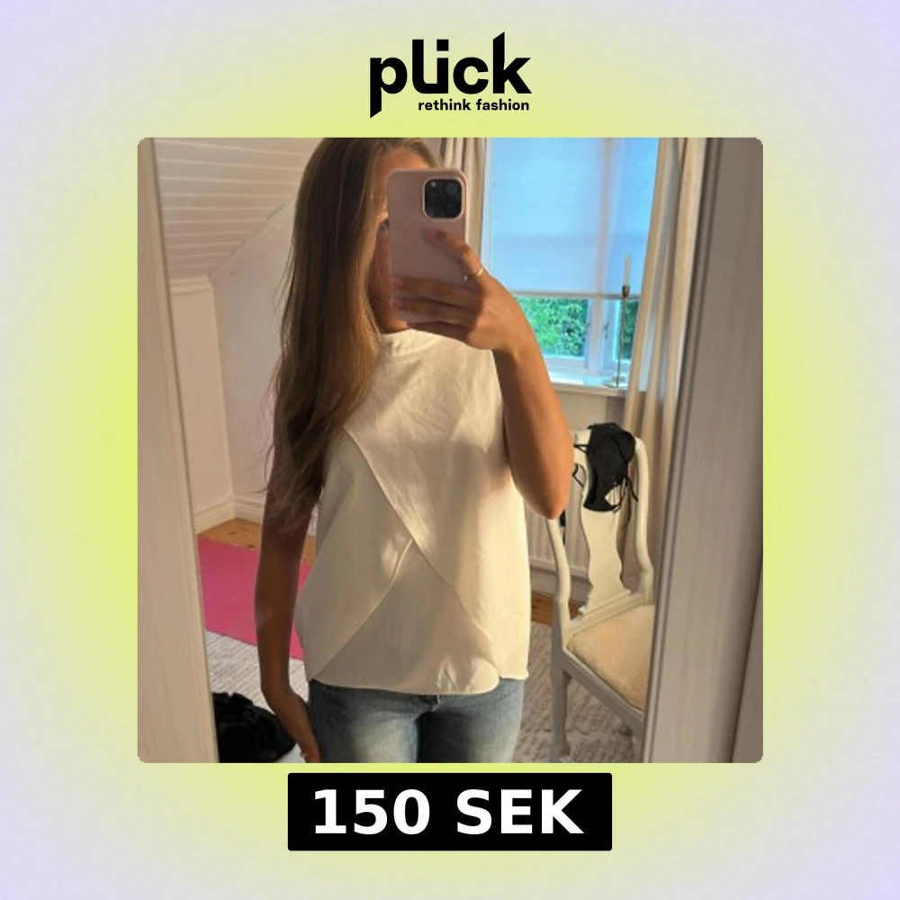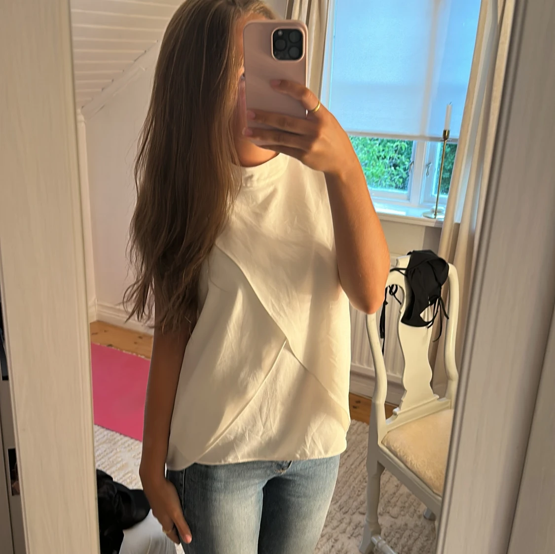 Säljer en stilren vit ärmlös blus med snygg omlott-detalj framtill. Toppen har en rak passform och är tillverkad i ett mjukt, lätt material som känns luftigt. Perfekt att matcha med jeans eller kjol för en clean look.