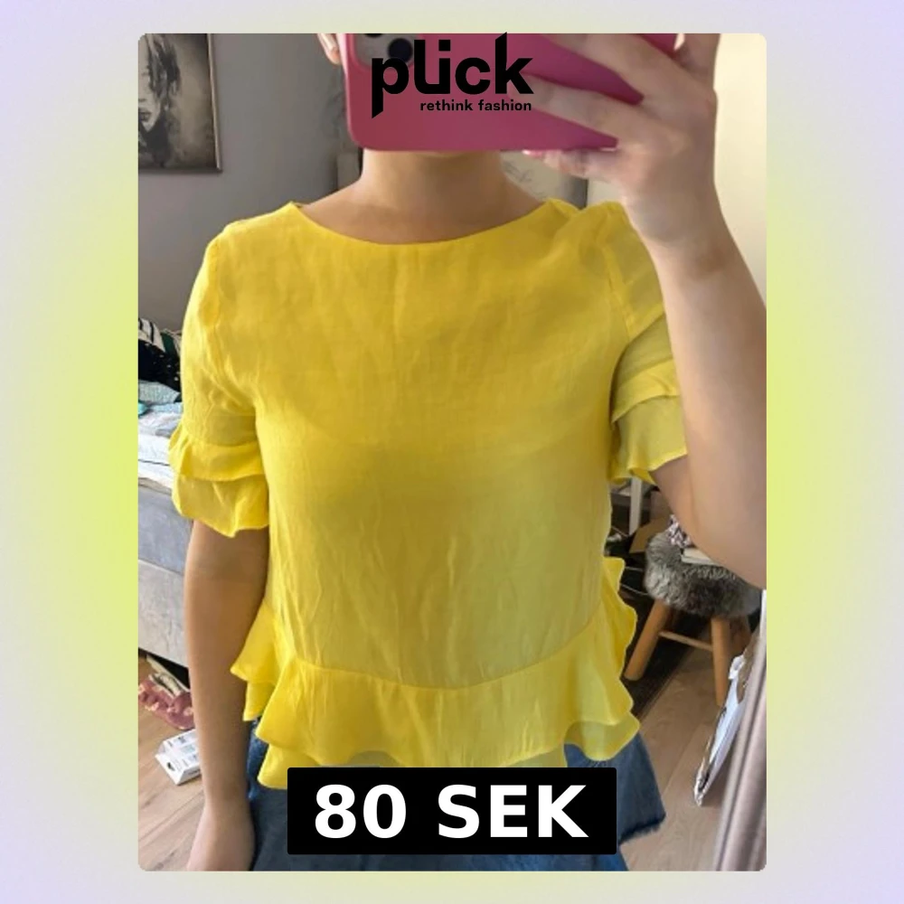 Säljer en superfin gul blus i lätt och luftig kvalitet. Toppen har volangdetaljer vid ärmslut och nederkant, samt en unik öppen rygg med knytband. Perfekt för dig som vill sticka ut med färg och detaljer. Passar till både jeans och kjol!