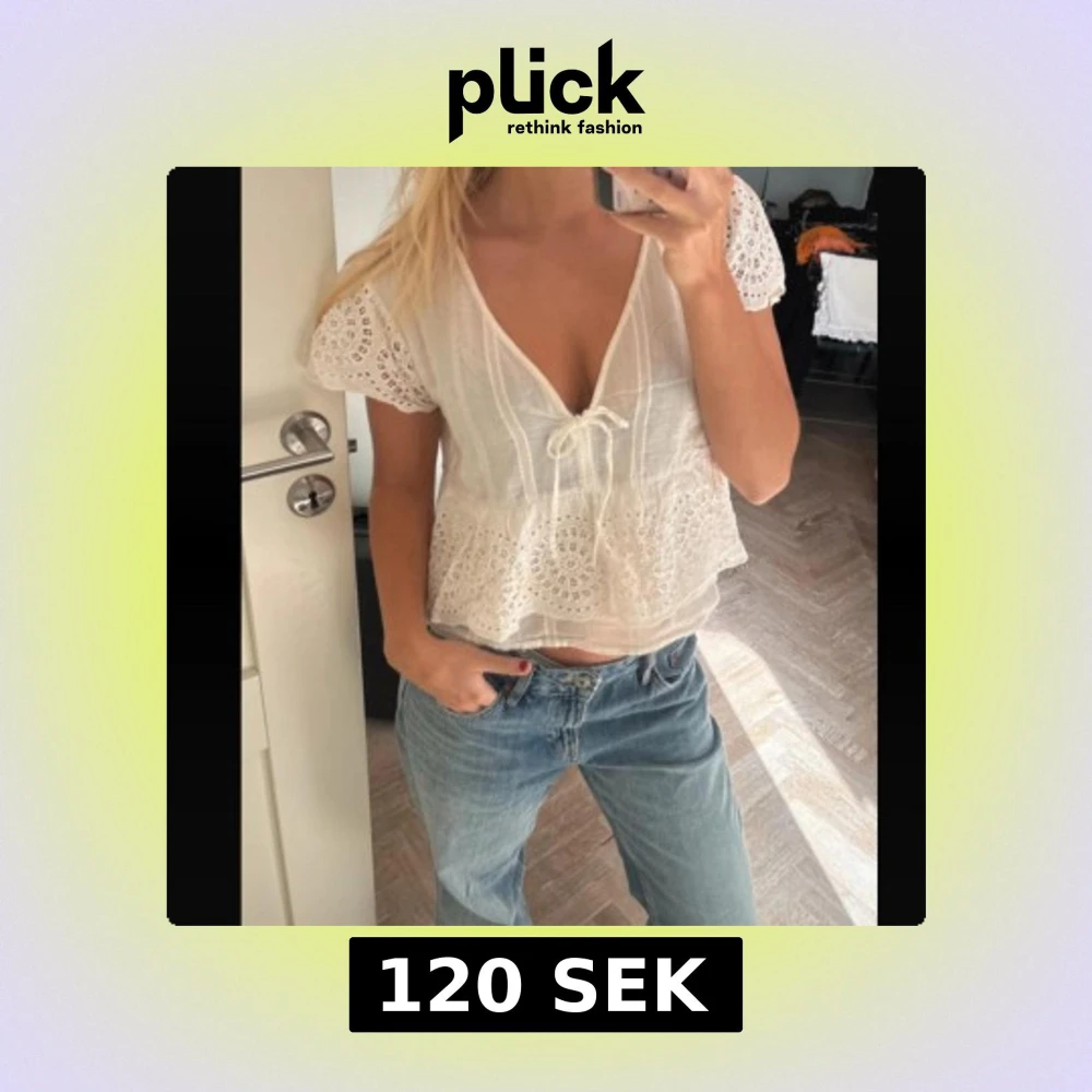 Supersöt vit blus i tunn bomull med broderade spetsdetaljer och volang nedtill. Djup v-ringning med knyt framtill och korta ärmar med broderat mönster. 🩷