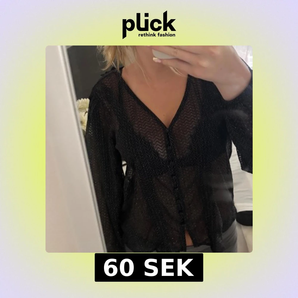 Säljer en transparent svart blus med glittriga detaljer och subtilt sicksackmönster. Blusen har v-ringning, långa ärmar och knappar framtill. Perfekt för dig som vill sticka ut lite extra med en snygg och trendig topp.