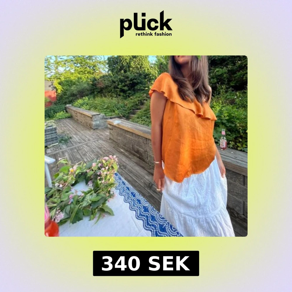 Säljer en snygg orange linnetopp med omlott-design och bred volang längs halsringningen. Toppen är ärmlös och har en luftig passform, perfekt för varma dagar. Materialet är linne och färgen är en djup orange som verkligen poppar.